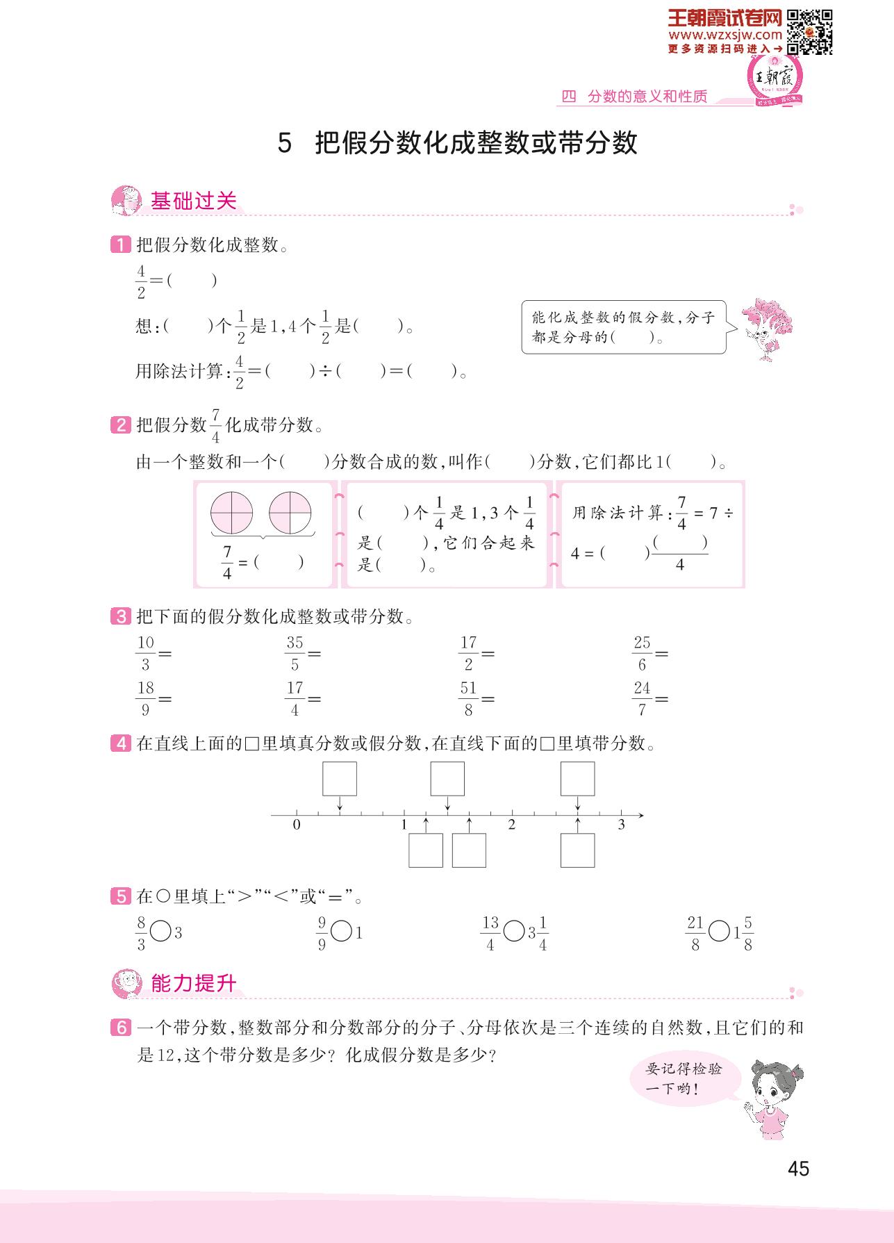 2023下册五年级数学苏教版 四 分数的意义和性质——5 把假分数化成整数或带分数
