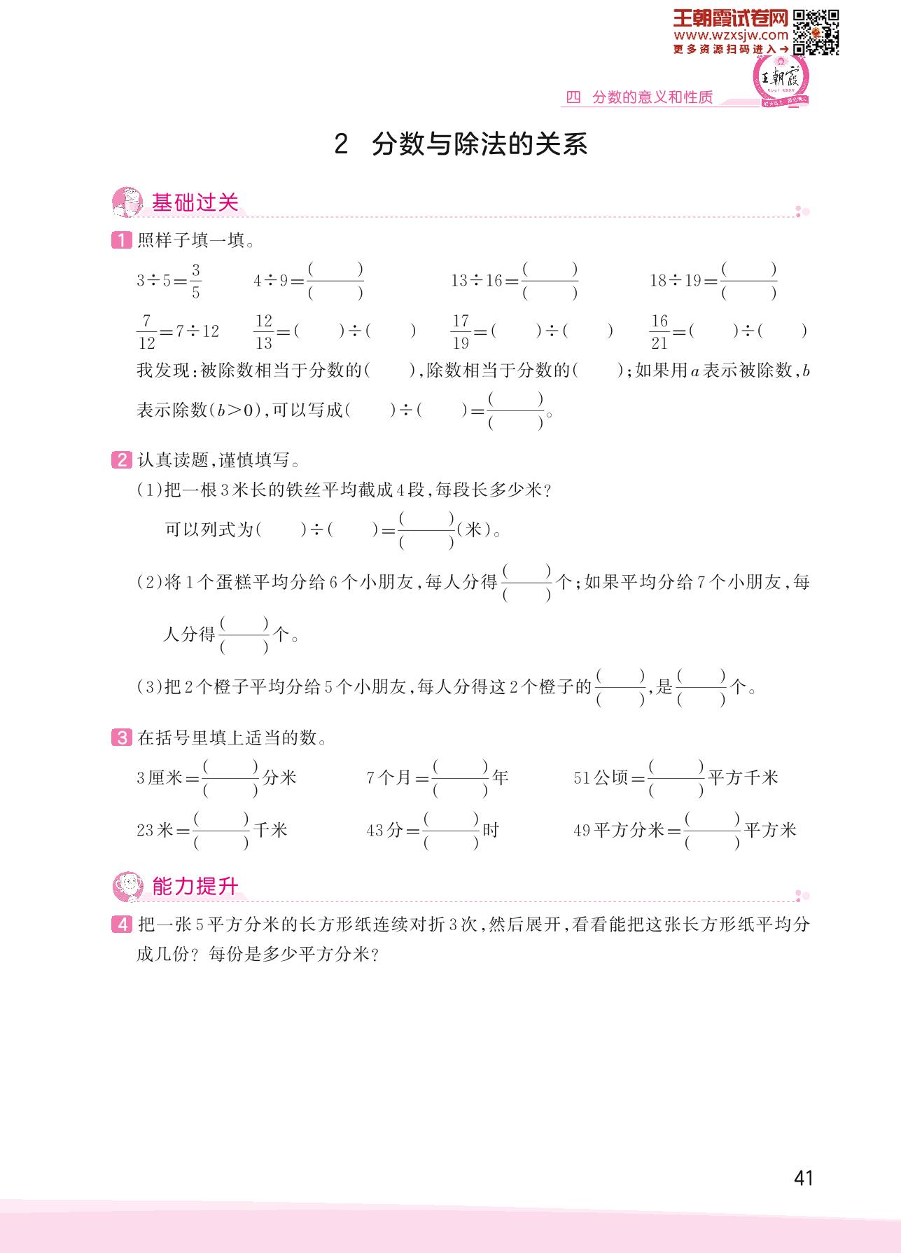 2023下册五年级数学苏教版 四 分数的意义和性质——2 分数与除法的关系