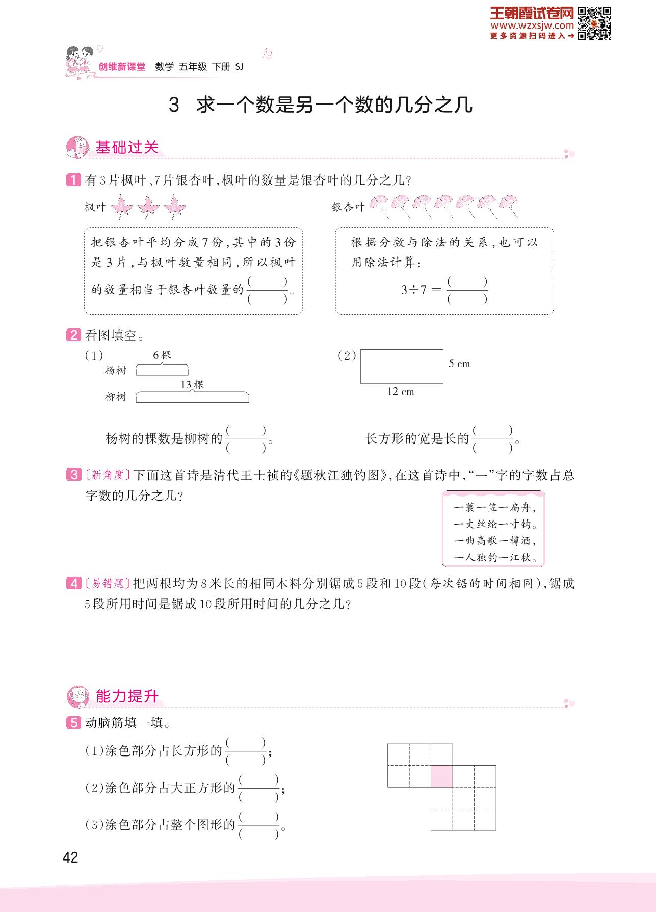 2023下册五年级数学苏教版 四 分数的意义和性质——3 求一个数是另一个数的几分之几