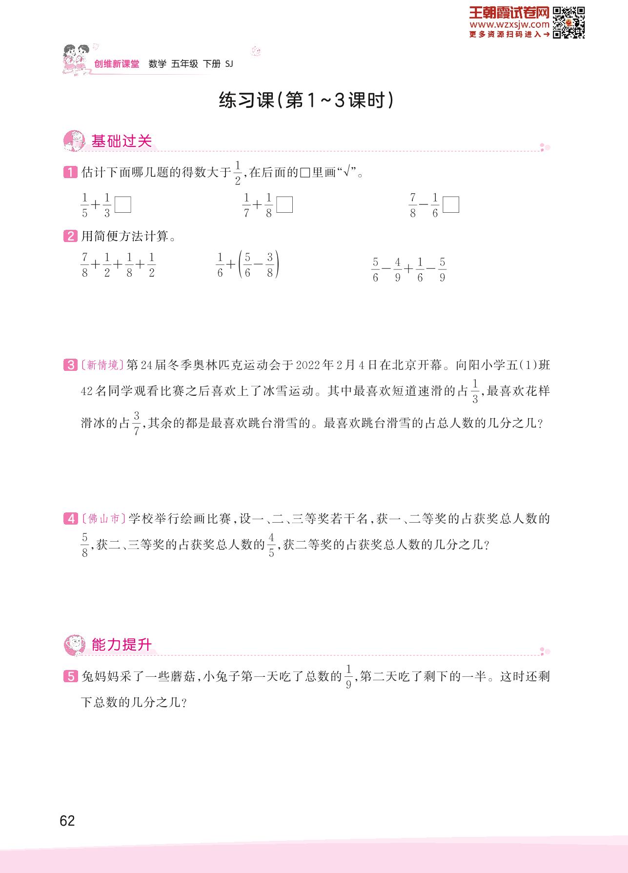 2023下册五年级数学苏教版 五 分数加法和减法——练习课(第1~3课时)