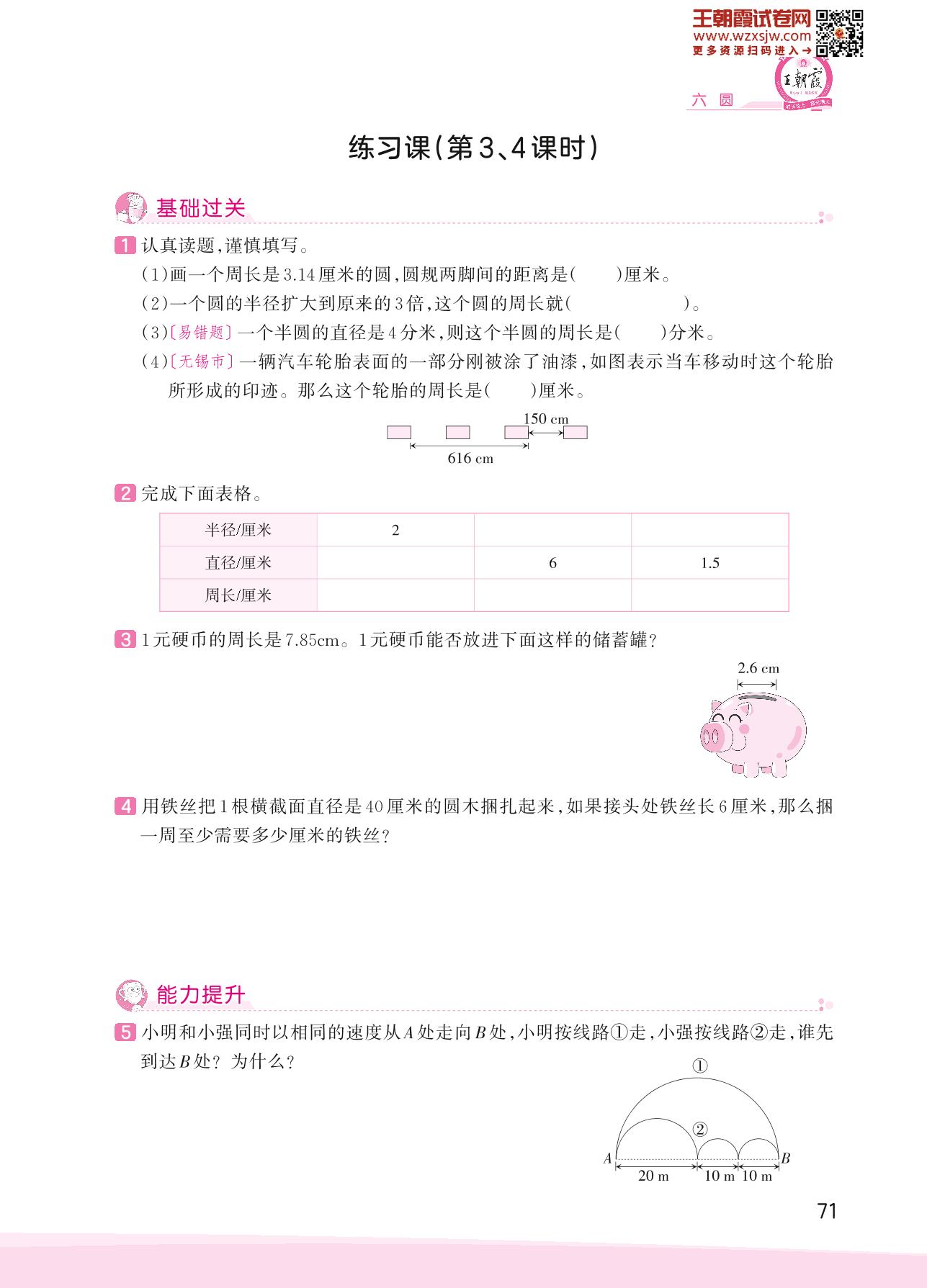 2023下册五年级数学苏教版 六 圆——练习课(第3、4课时)