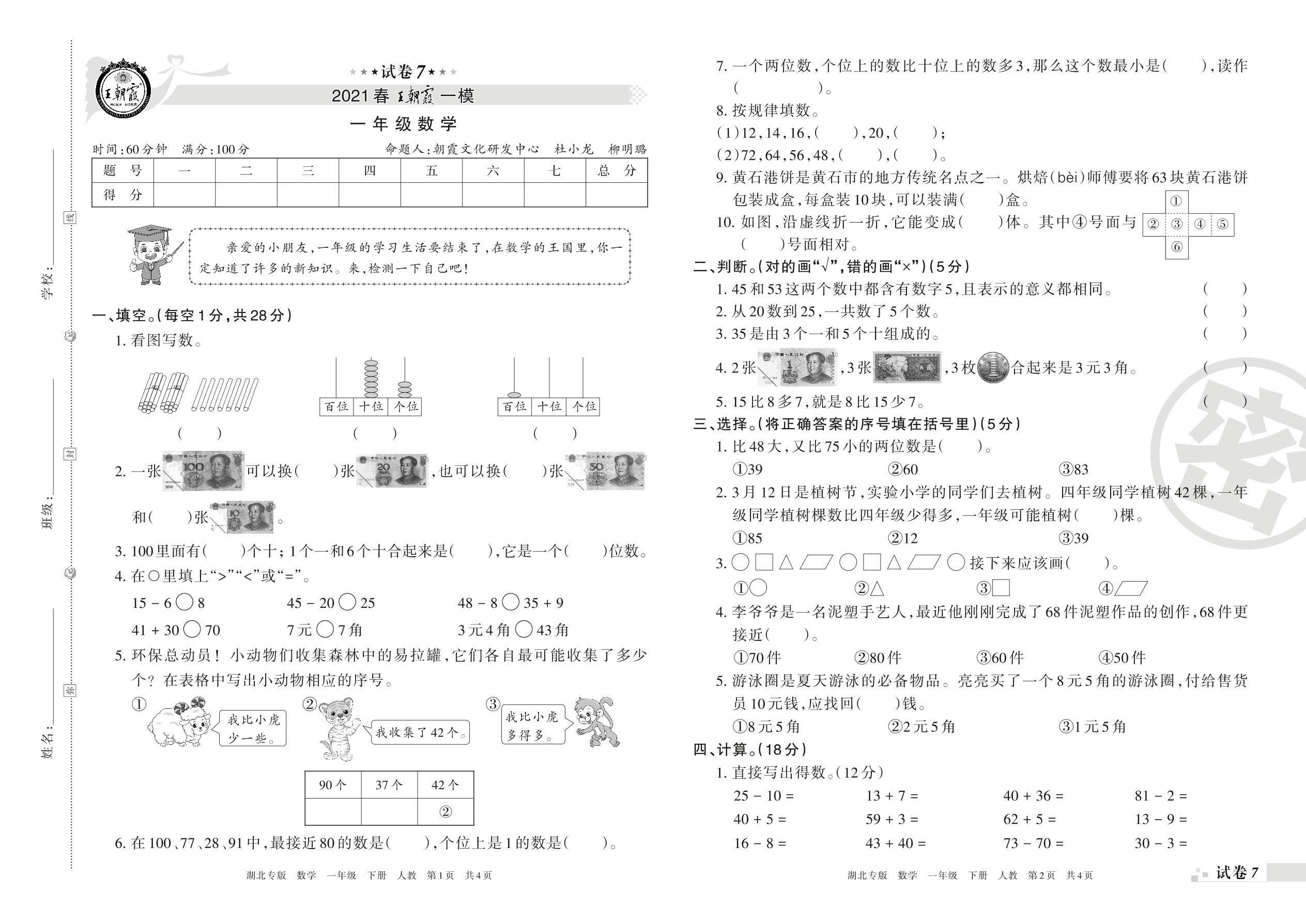 王朝霞期末模拟卷一年级下册数学(人教版)_R210802210610【7】