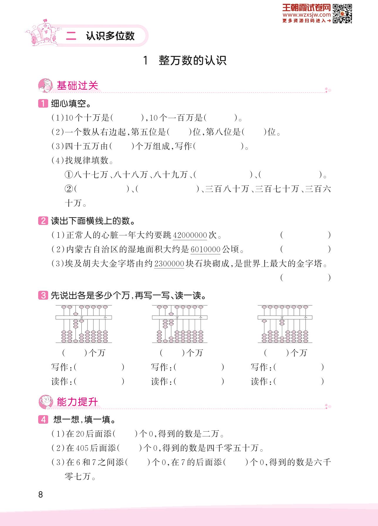 2023下册四年级数学苏教版 二 认识多位数——1 整万数的认识