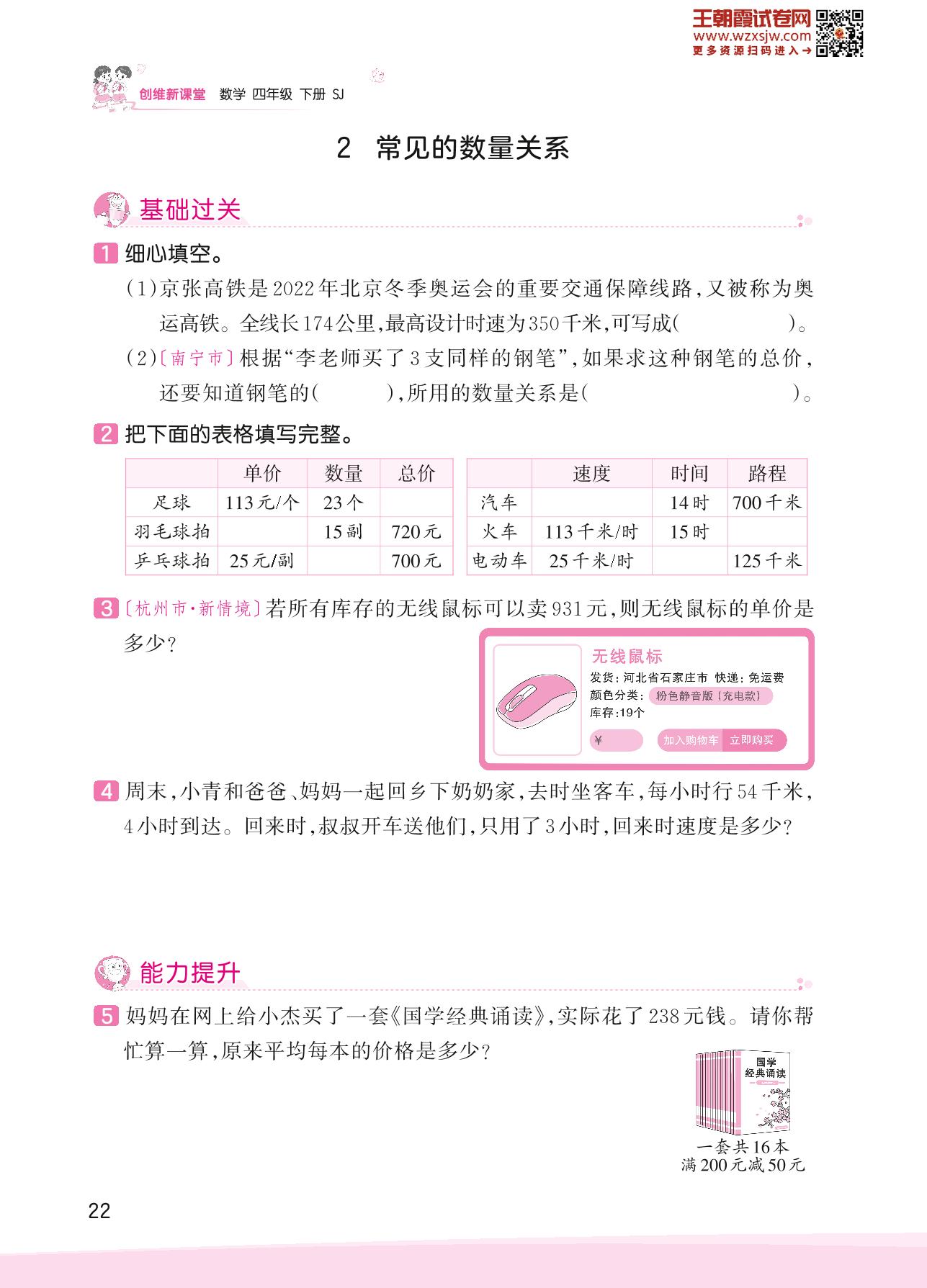 2023下册四年级数学苏教版 三 三位数乘两位数——2 常见的数量关系