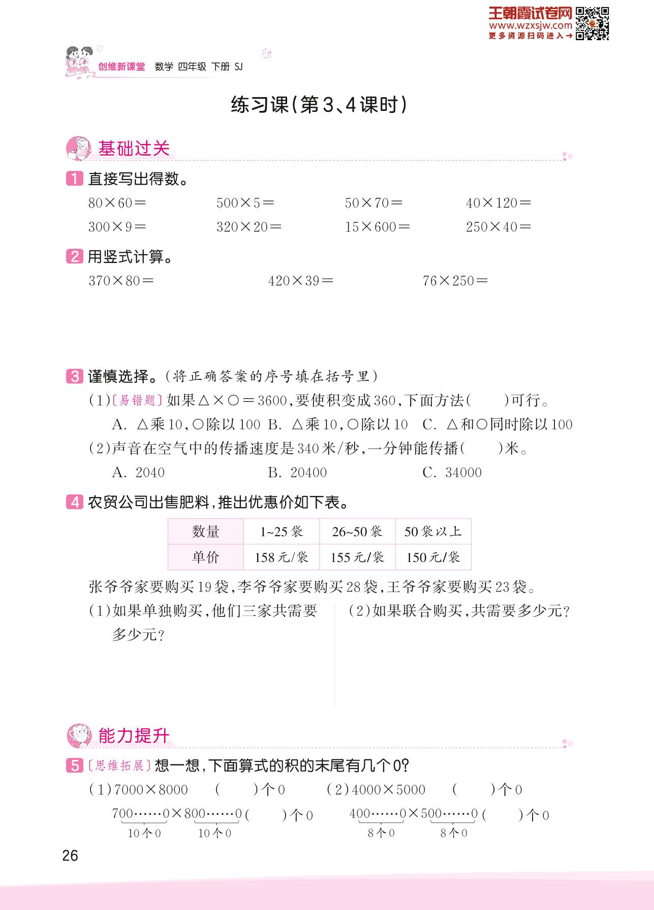 2023下册四年级数学苏教版 三 三位数乘两位数——练习课(第3、4课时)