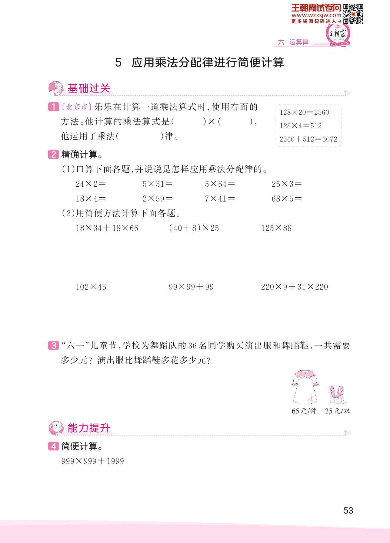 2023下册四年级数学苏教版 六 运算律——5 应用乘法分配律进行简便计算
