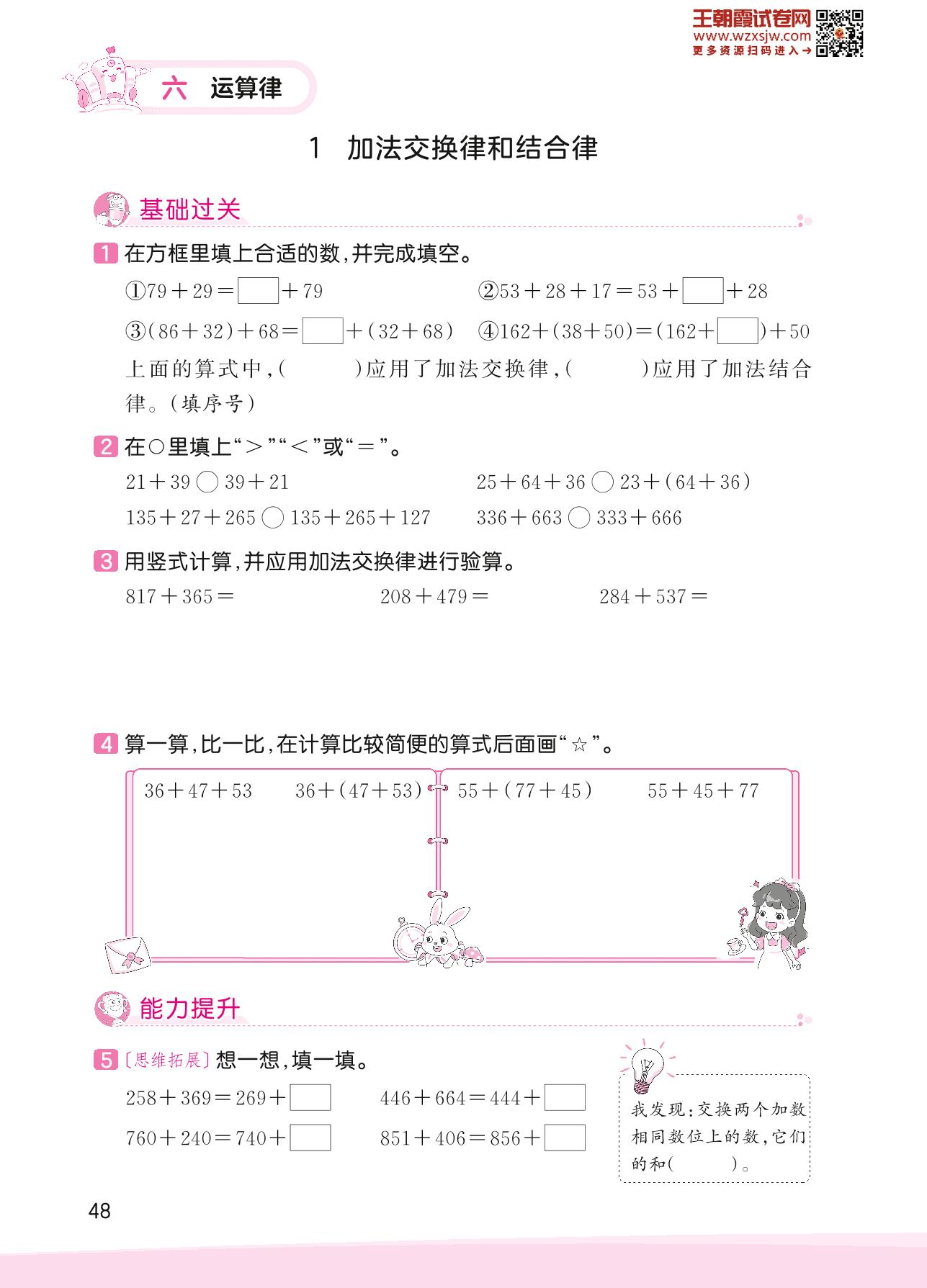 2023下册四年级数学苏教版 六 运算律——1 加法交换律和结合律