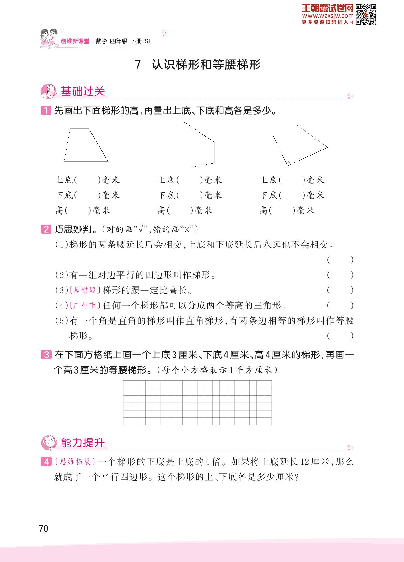 2023下册四年级数学苏教版 七 三角形、平行四边形和梯形——7 认识梯形和等腰梯形