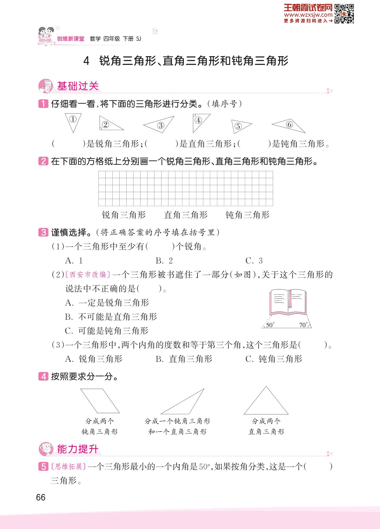 2023下册四年级数学苏教版 七 三角形、平行四边形和梯形——4 锐角三角形、直角三角形和钝角三角形