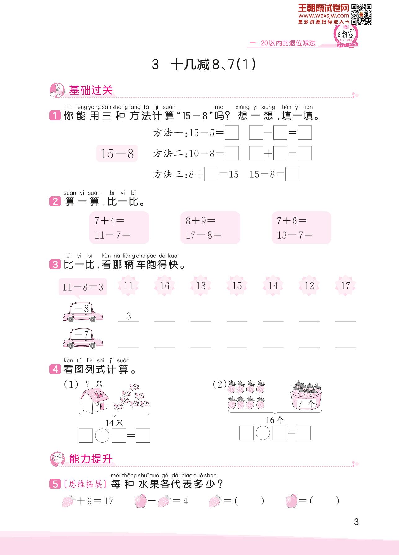 2023下册一年级数学苏教版 一 20以内的退位减法——3 十几减8、7(1)