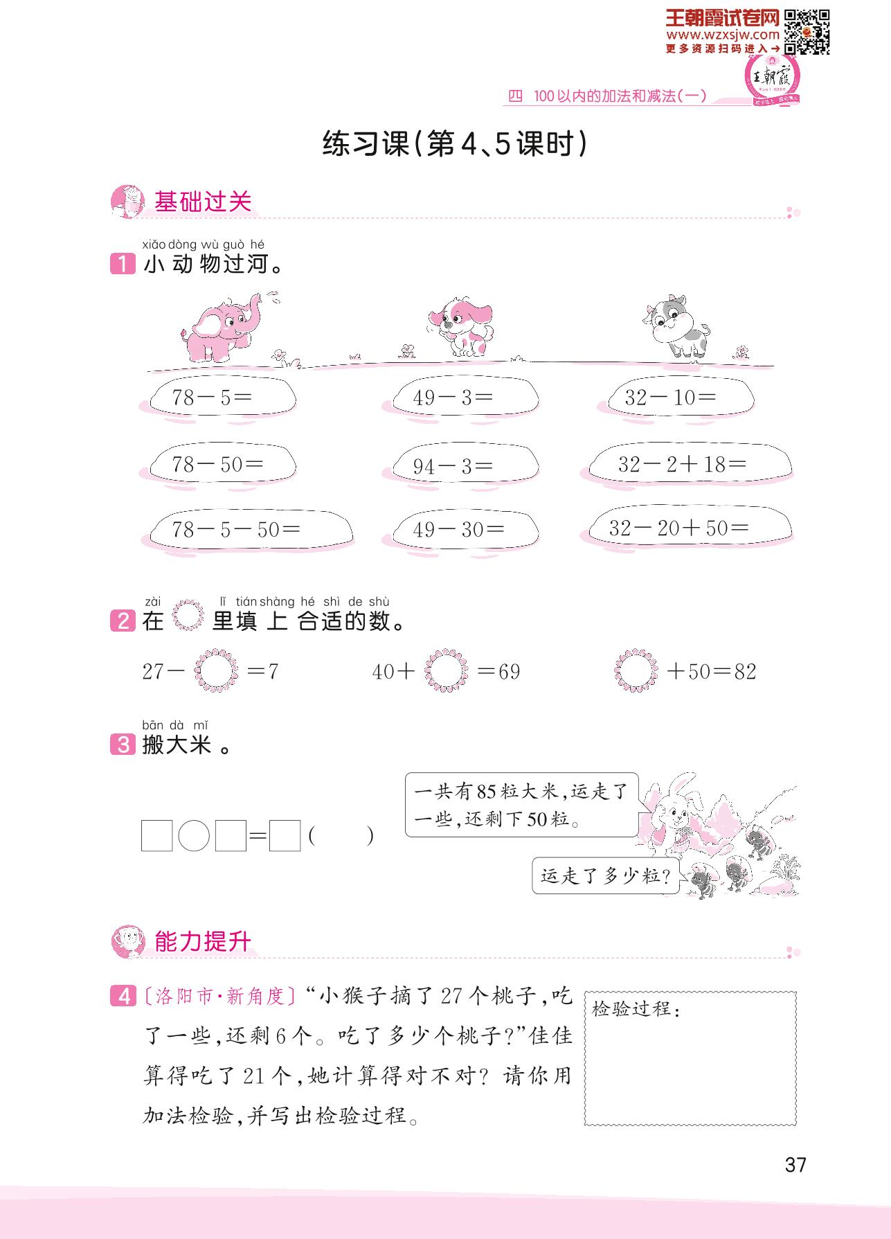 2023下册一年级数学苏教版 四 100以内的加法和减法(一)——练习课(第4、5课时)