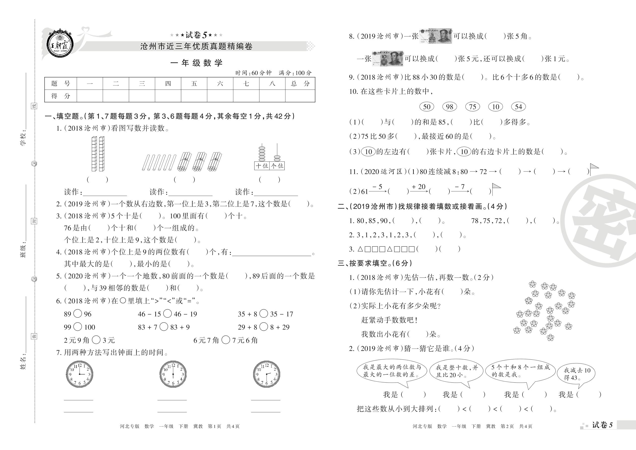 沧州市近三年优质真题精编卷一年级下册数学(冀教版)【5】