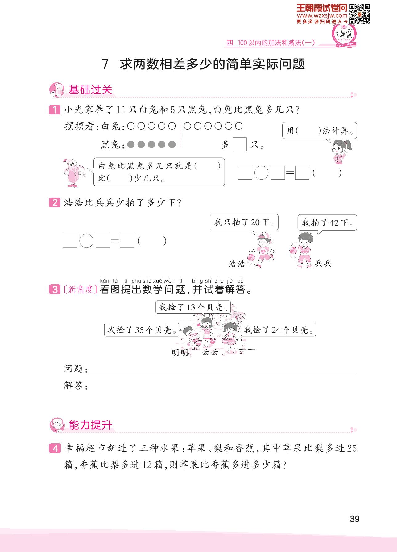 2023下册一年级数学苏教版 四 100以内的加法和减法(一)——7 求两数相差多少的简单实际问题