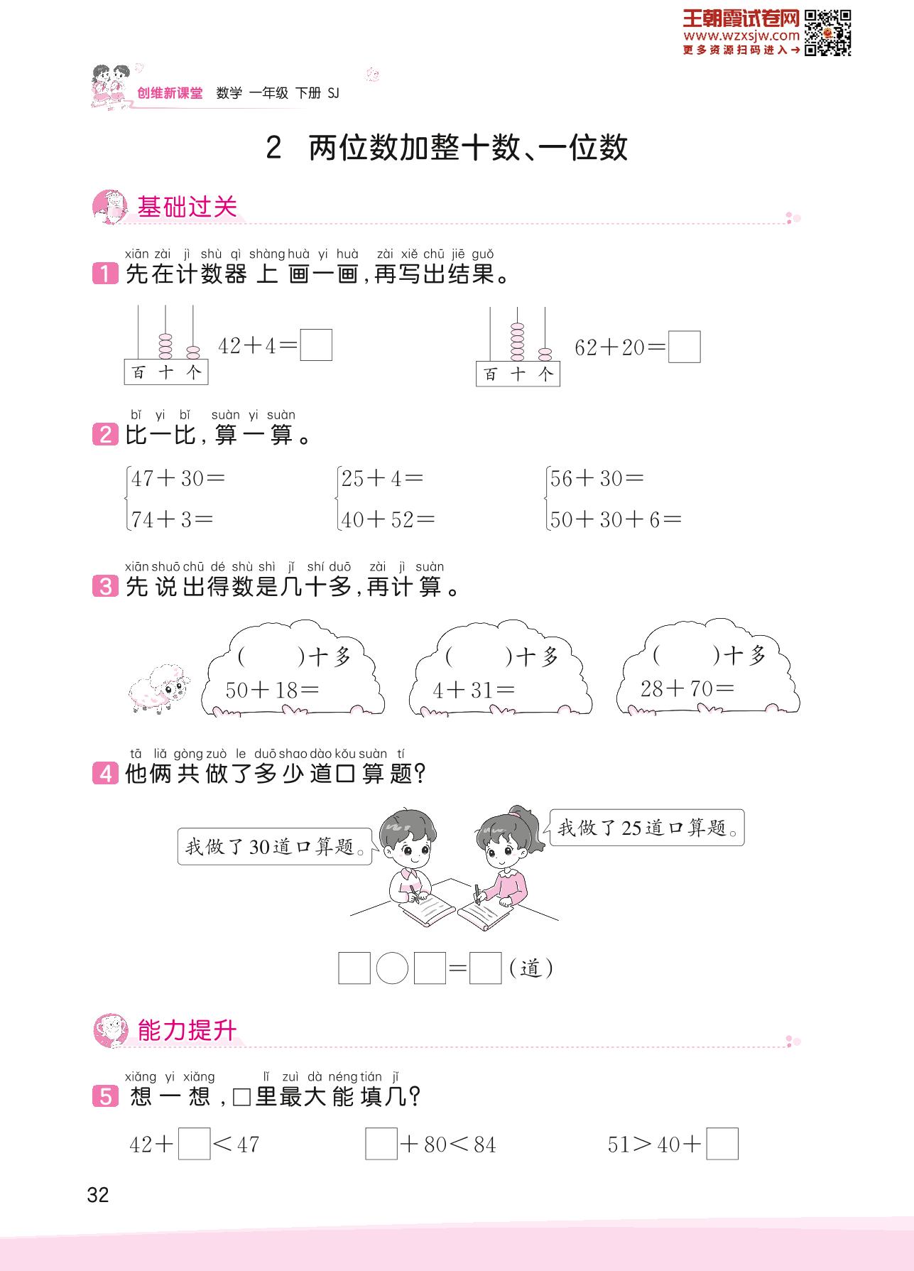 2023下册一年级数学苏教版 四 100以内的加法和减法(一)——2 两位数加整十数、一位数