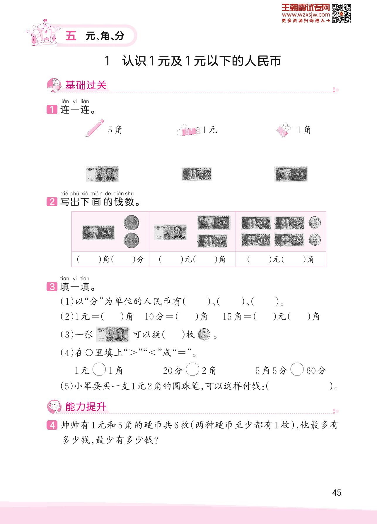 2023下册一年级数学苏教版 五 元、角、分——1 认识1元及1元以下的人民币