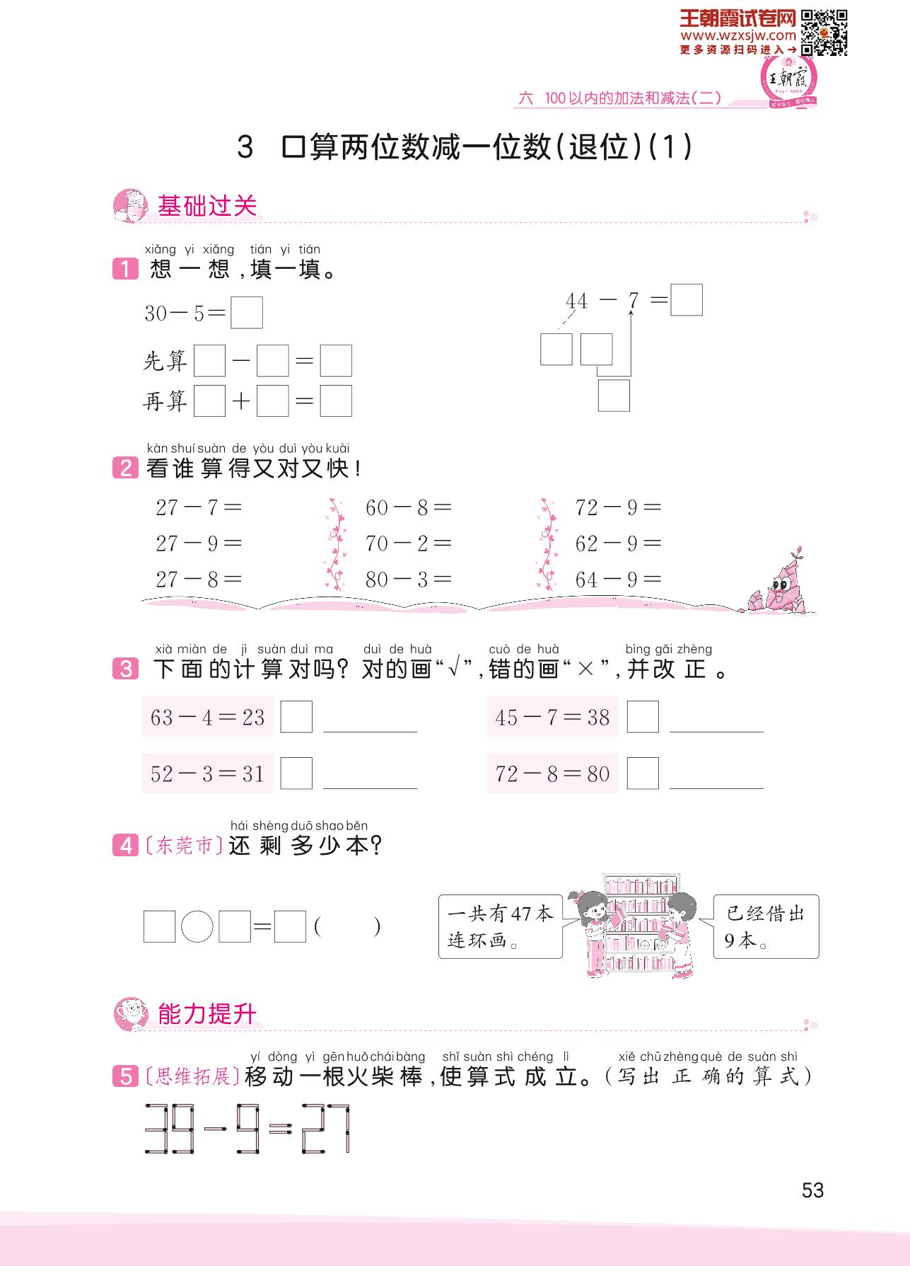 2023下册一年级数学苏教版 六 100以内的加法和减法(二)——3 口算两位数减一位数(退位)(1)
