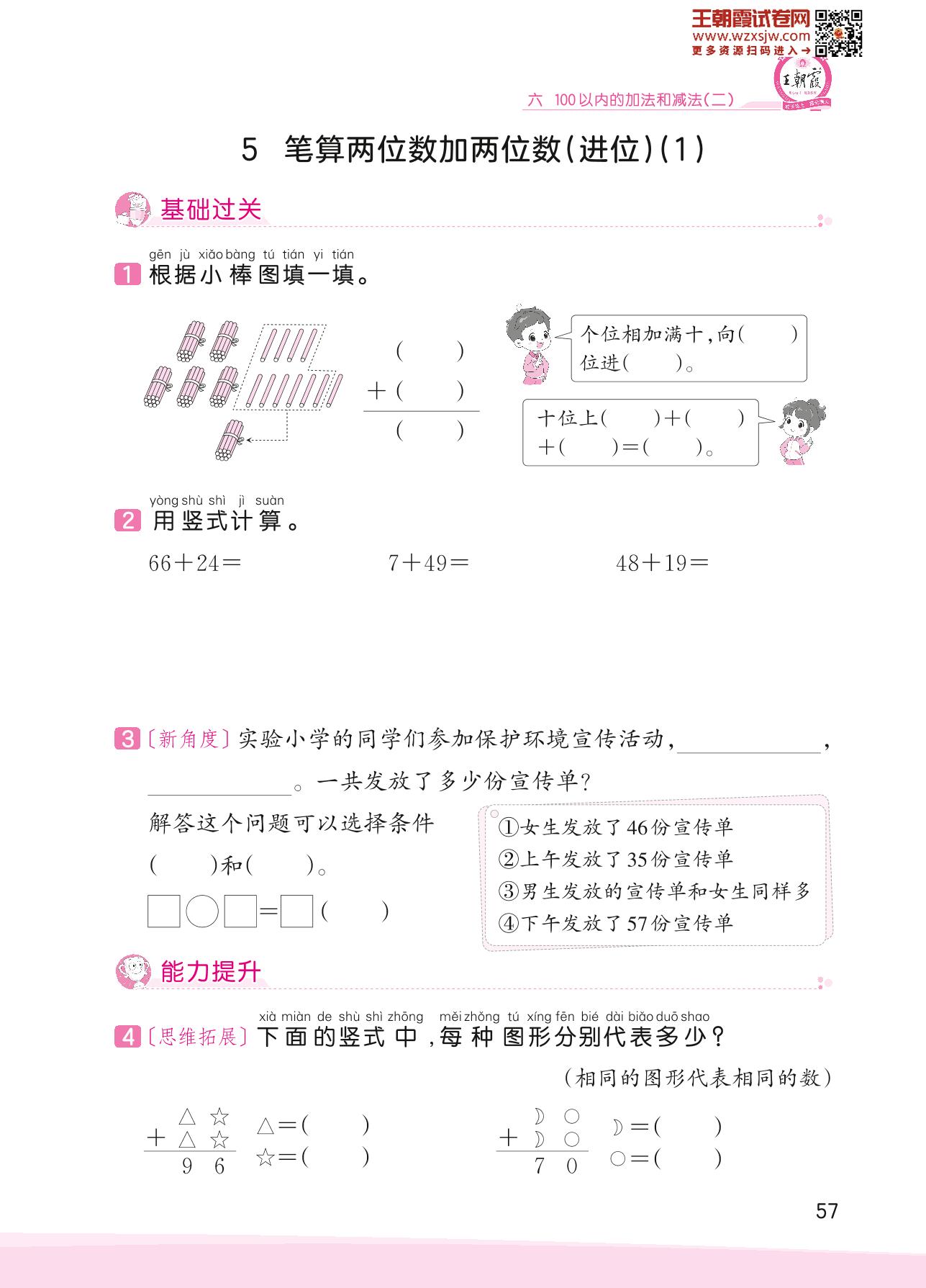 2023下册一年级数学苏教版 六 100以内的加法和减法(二)——5 笔算两位数加两位数(进位)(1)