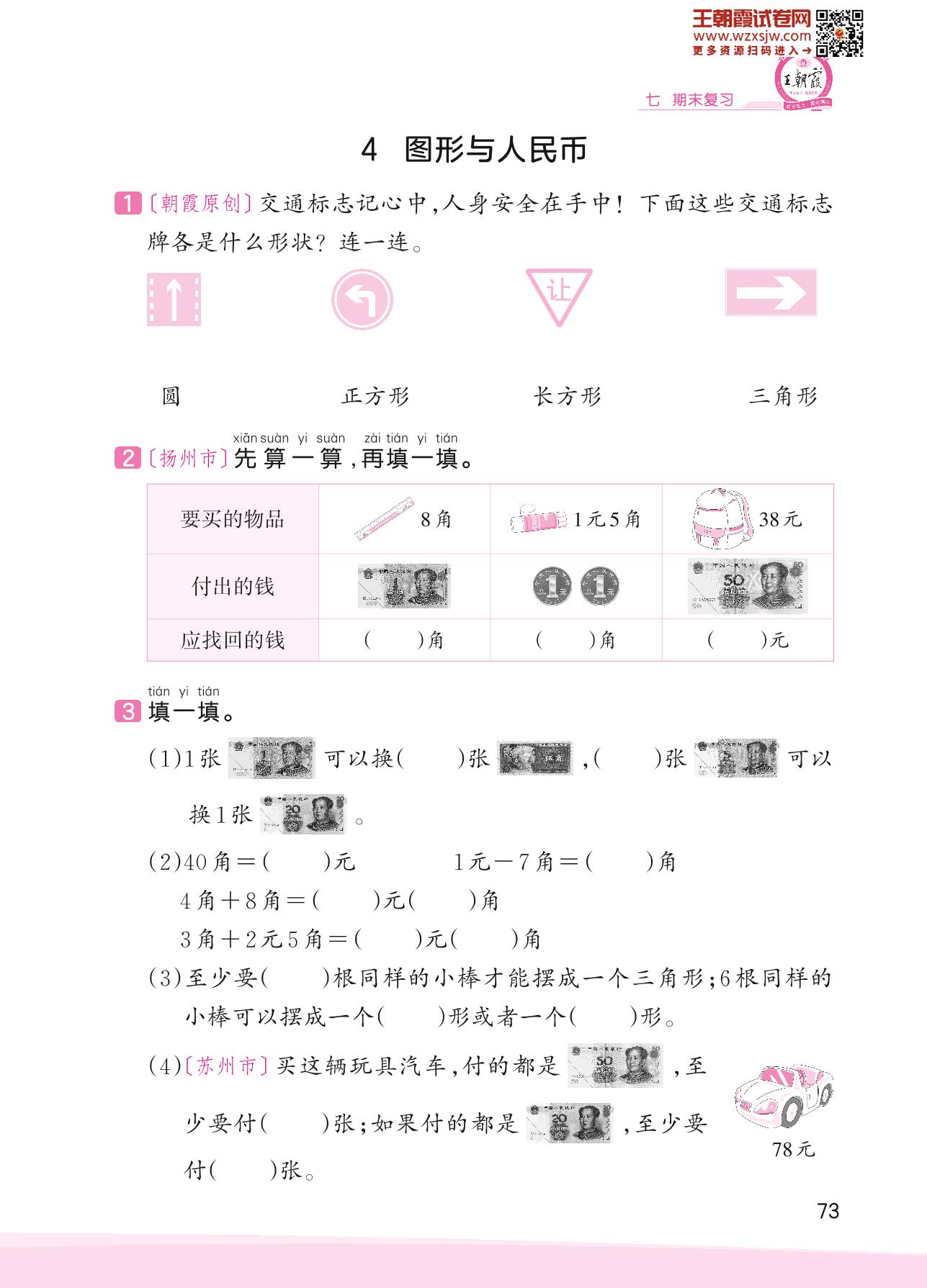 2023下册一年级数学苏教版 七 期末复习——4 图形与人民币