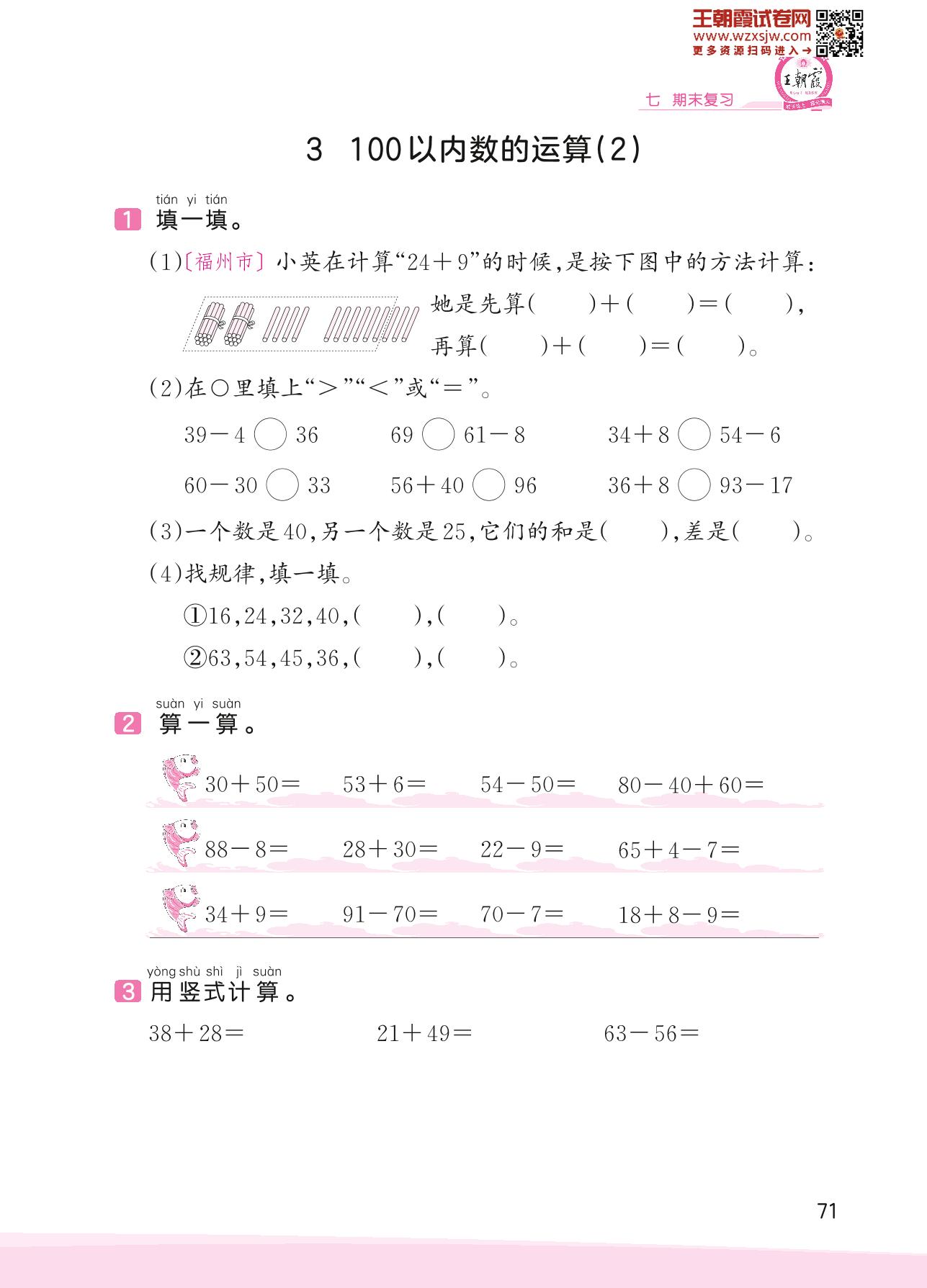 2023下册一年级数学苏教版 七 期末复习——3 100以内数的运算(2)