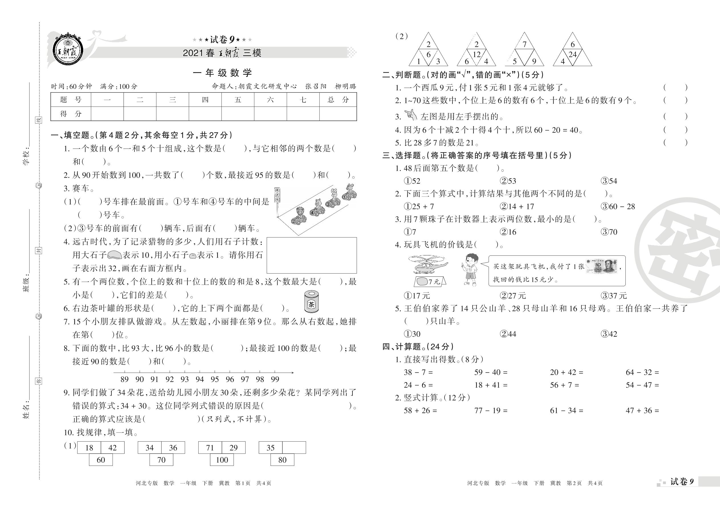 王朝霞期末模拟卷一年级下册数学(冀教版)_R210802210714【9】