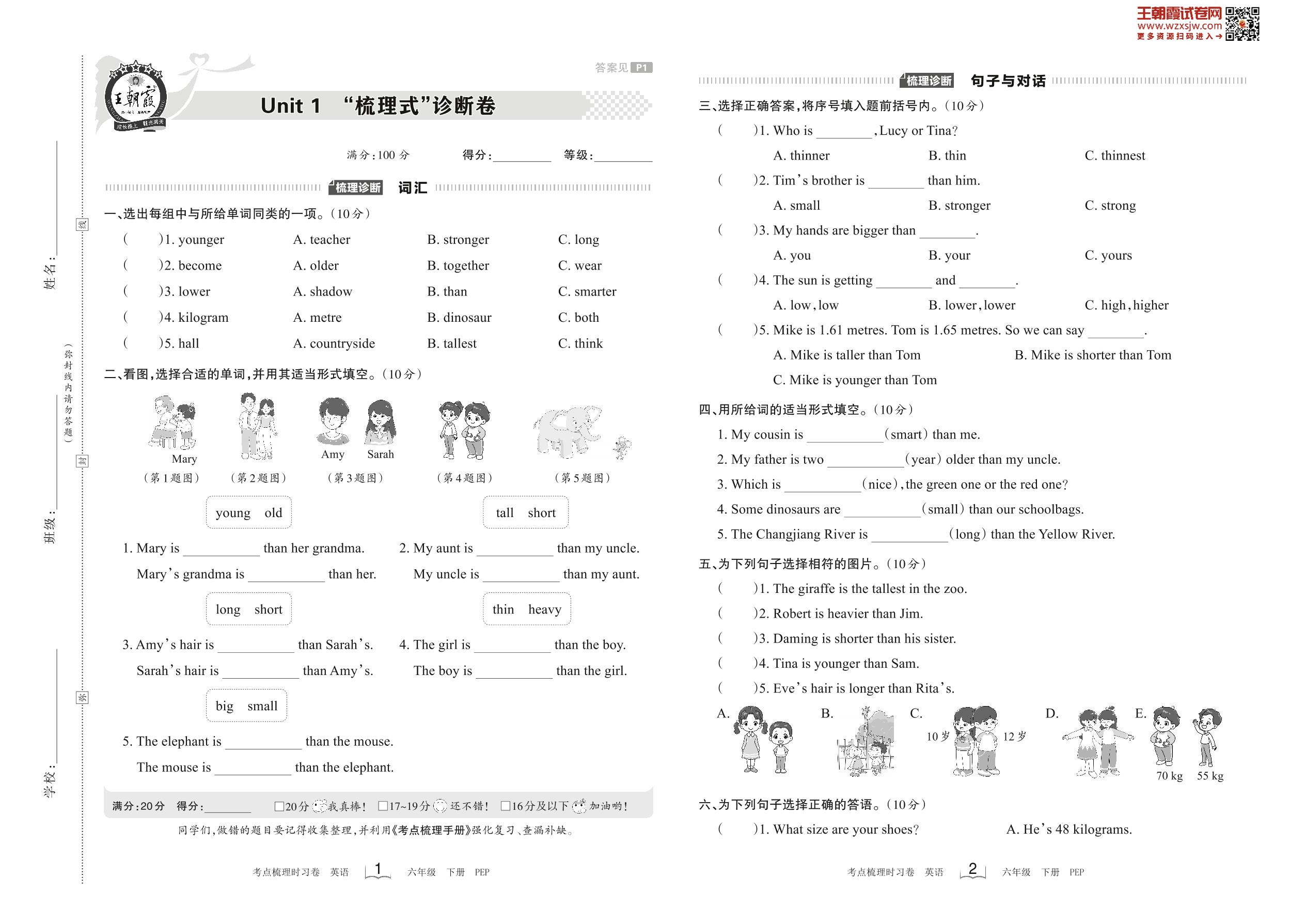 2023下册六年级英语人教PEP版 Unit 1 “梳理式”诊断卷