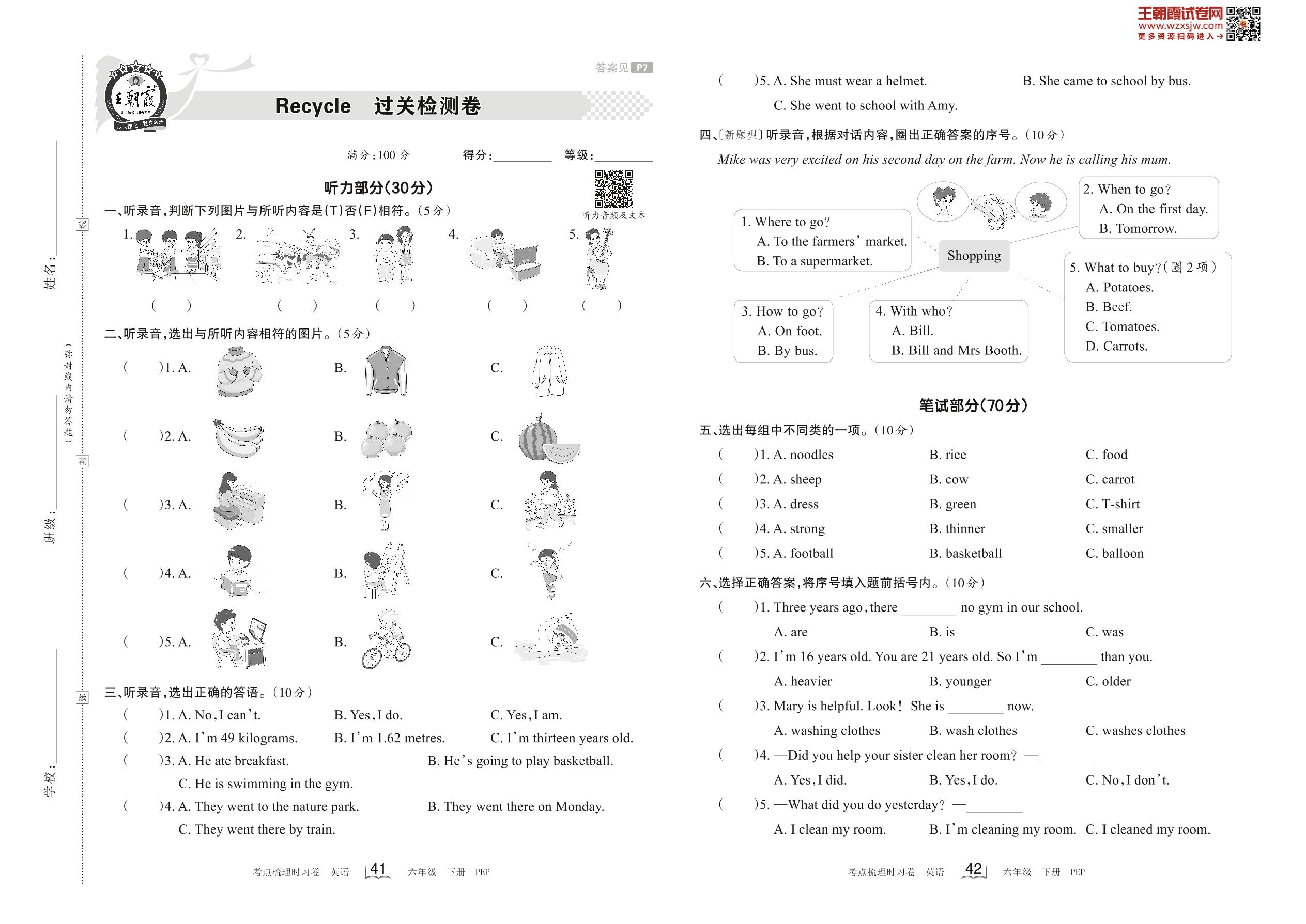 2023下册六年级英语人教PEP版 Recycle 过关检测卷