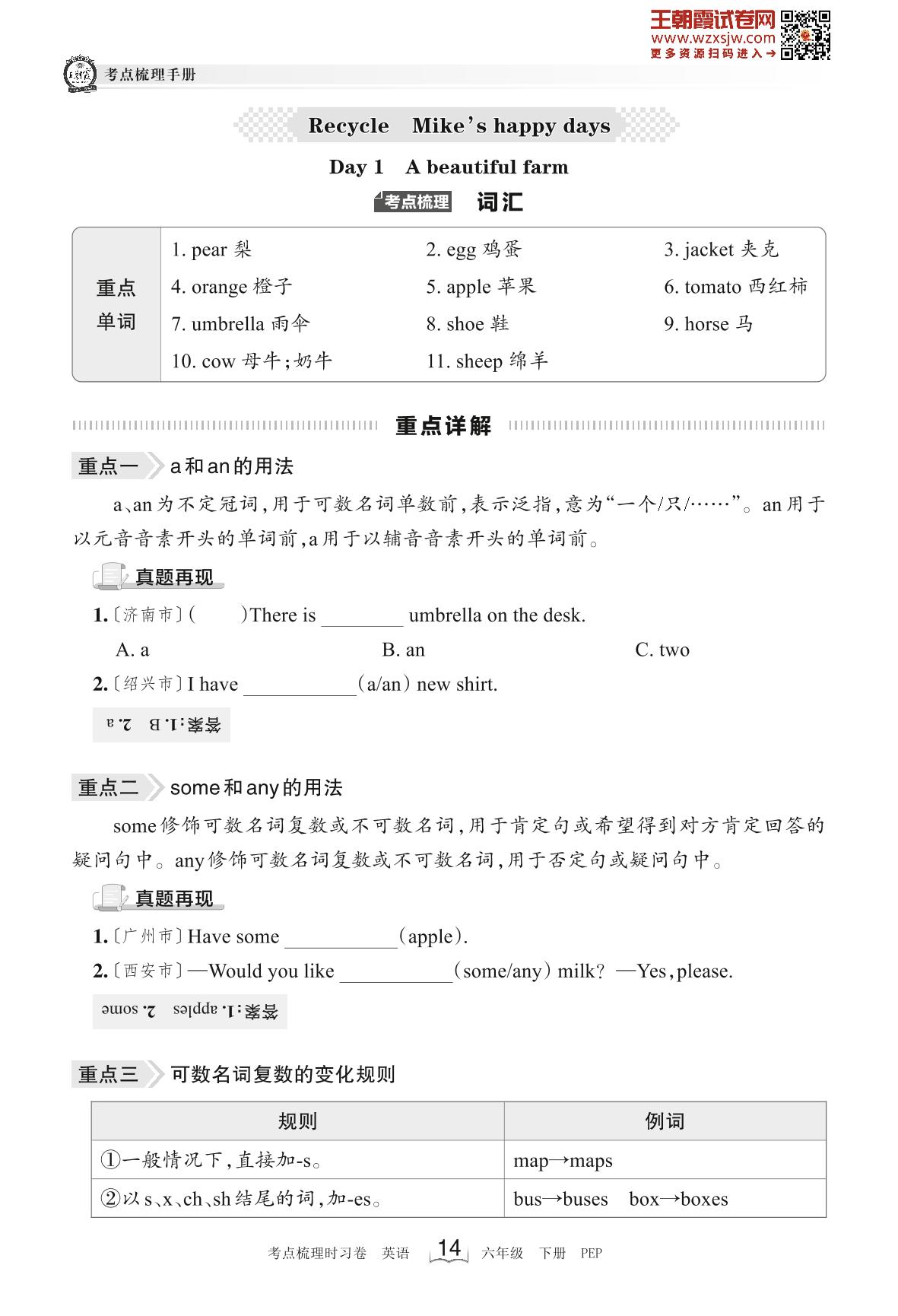 2023下册六年级英语人教PEP版 考点梳理手册——Recycle Mike‘s happy days
