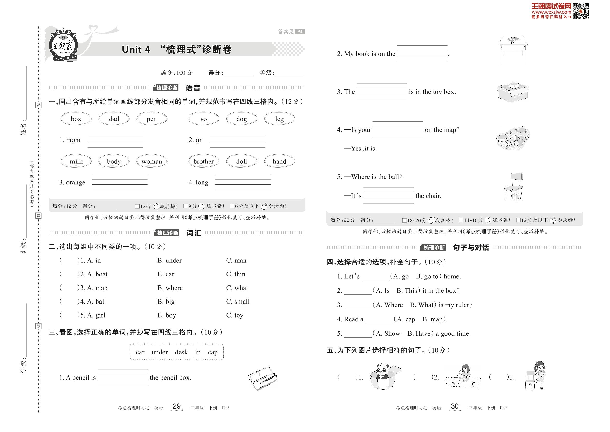 2023下册三年级英语人教PEP版 Unit 4 “梳理式”诊断卷