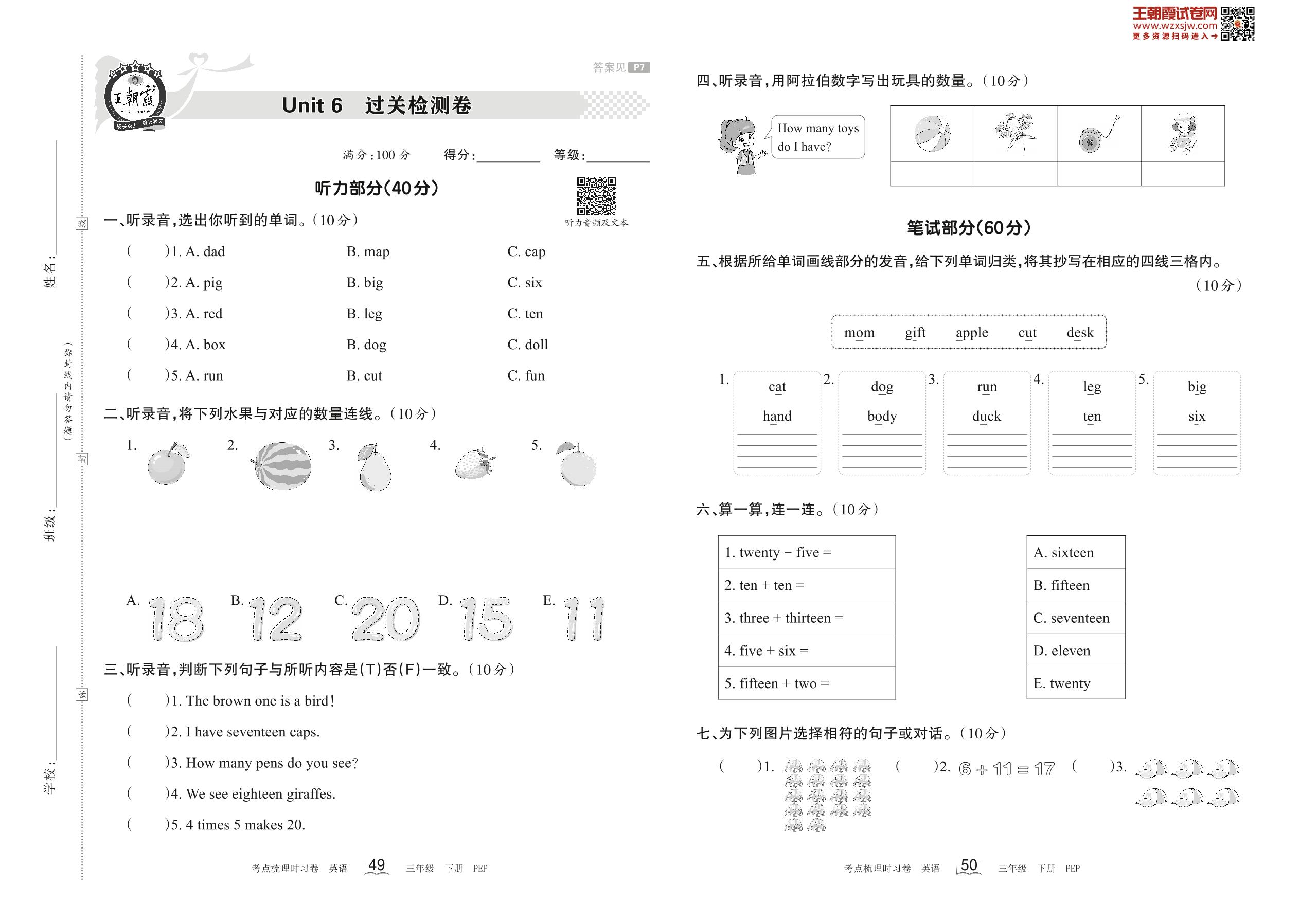 2023下册三年级英语人教PEP版 Unit 6 过关检测卷