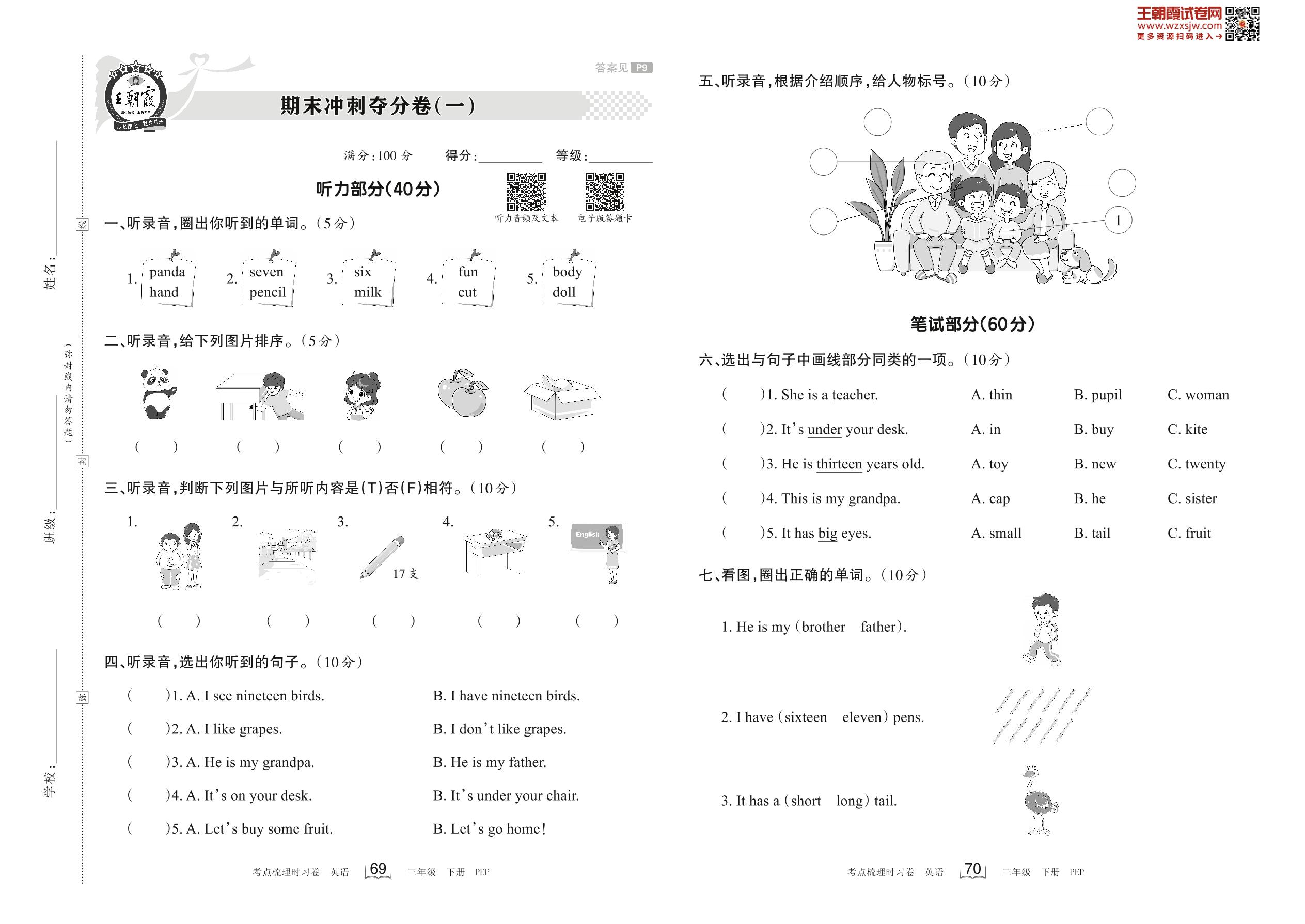 2023下册三年级英语人教PEP版 期末冲刺夺分卷(一)