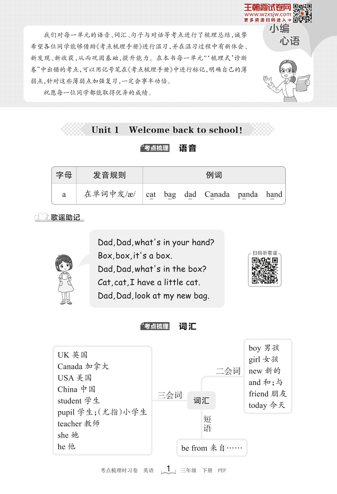 2023下册三年级英语人教PEP版 考点梳理手册——Unit 1 Welcome back to school!