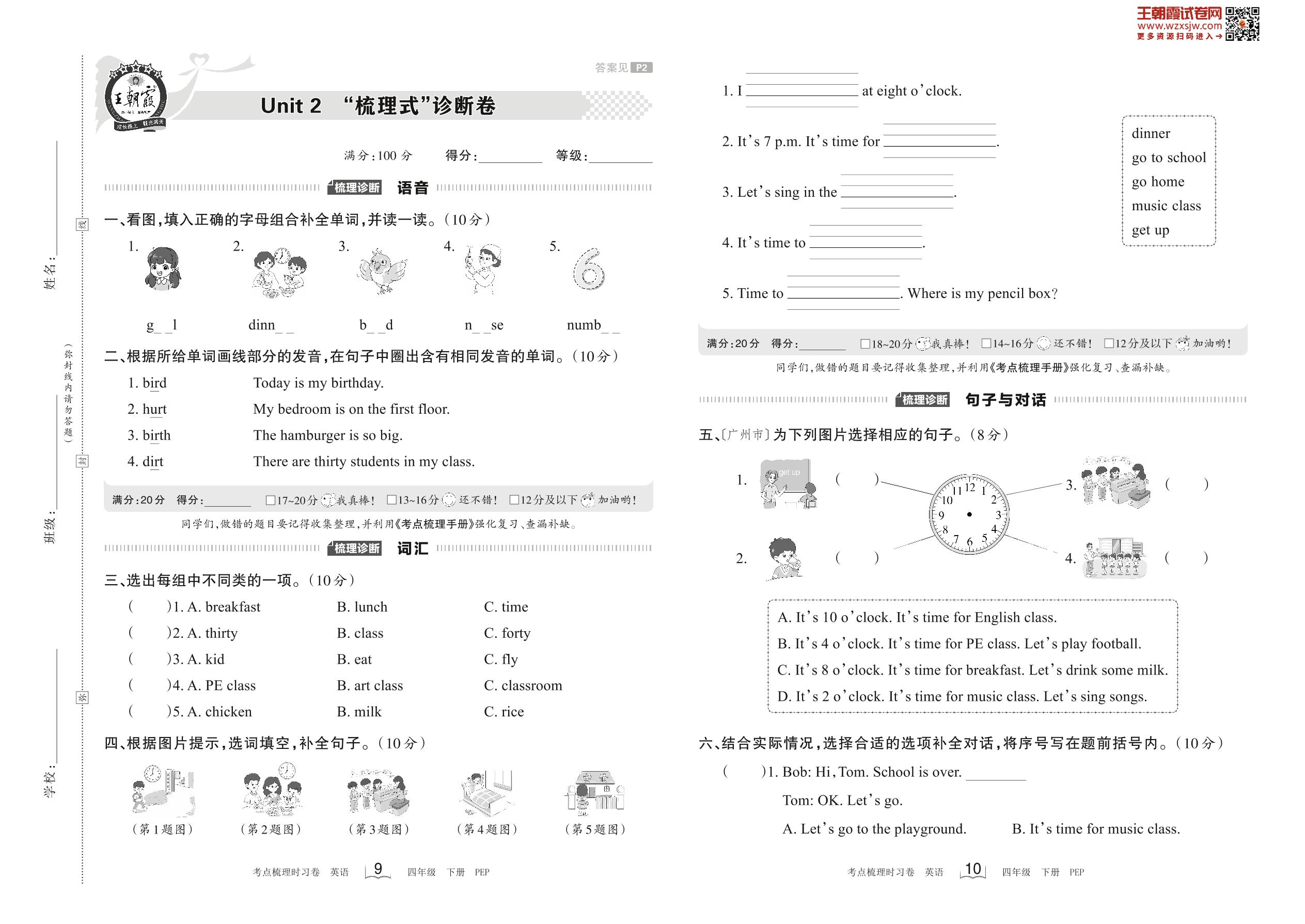 2023下册四年级英语人教PEP版 Unit 2 “梳理式”诊断卷