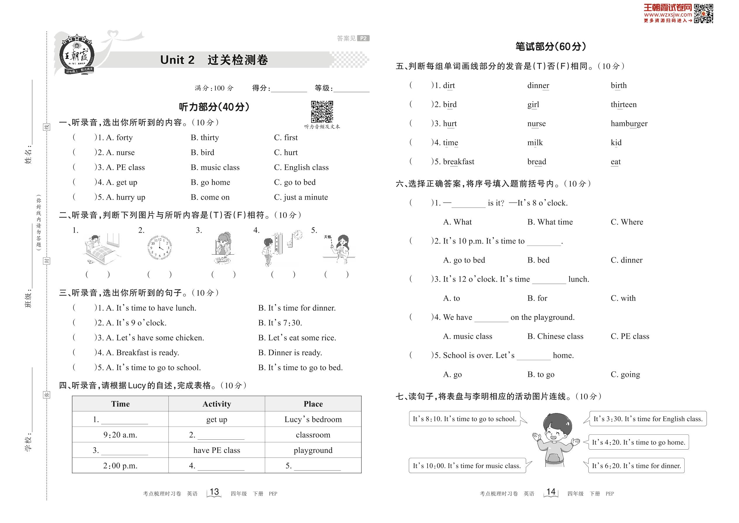 四年级英语人教PEP版(三起始)下册单元卷