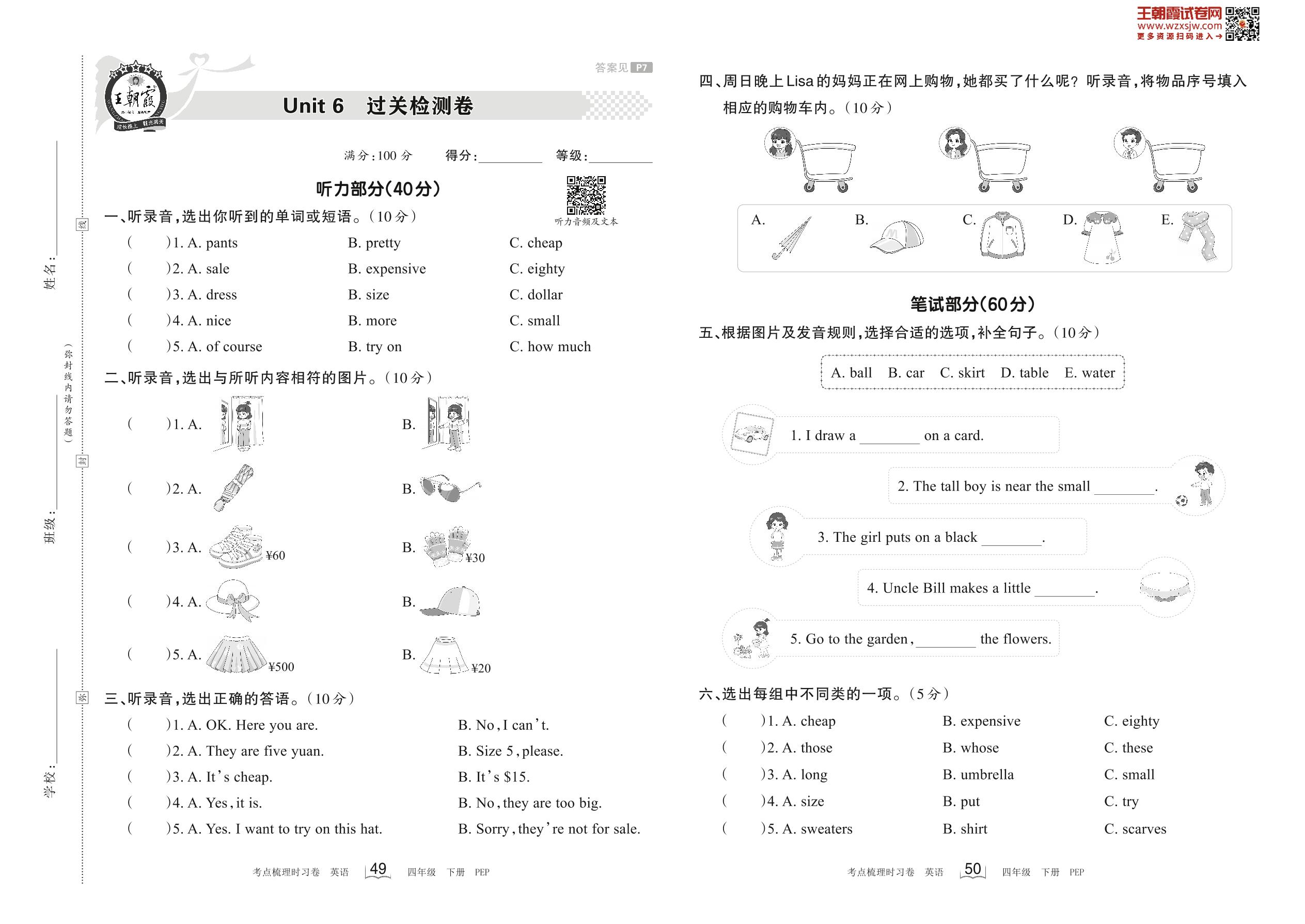 2023下册四年级英语人教PEP版 Unit 6 过关检测卷