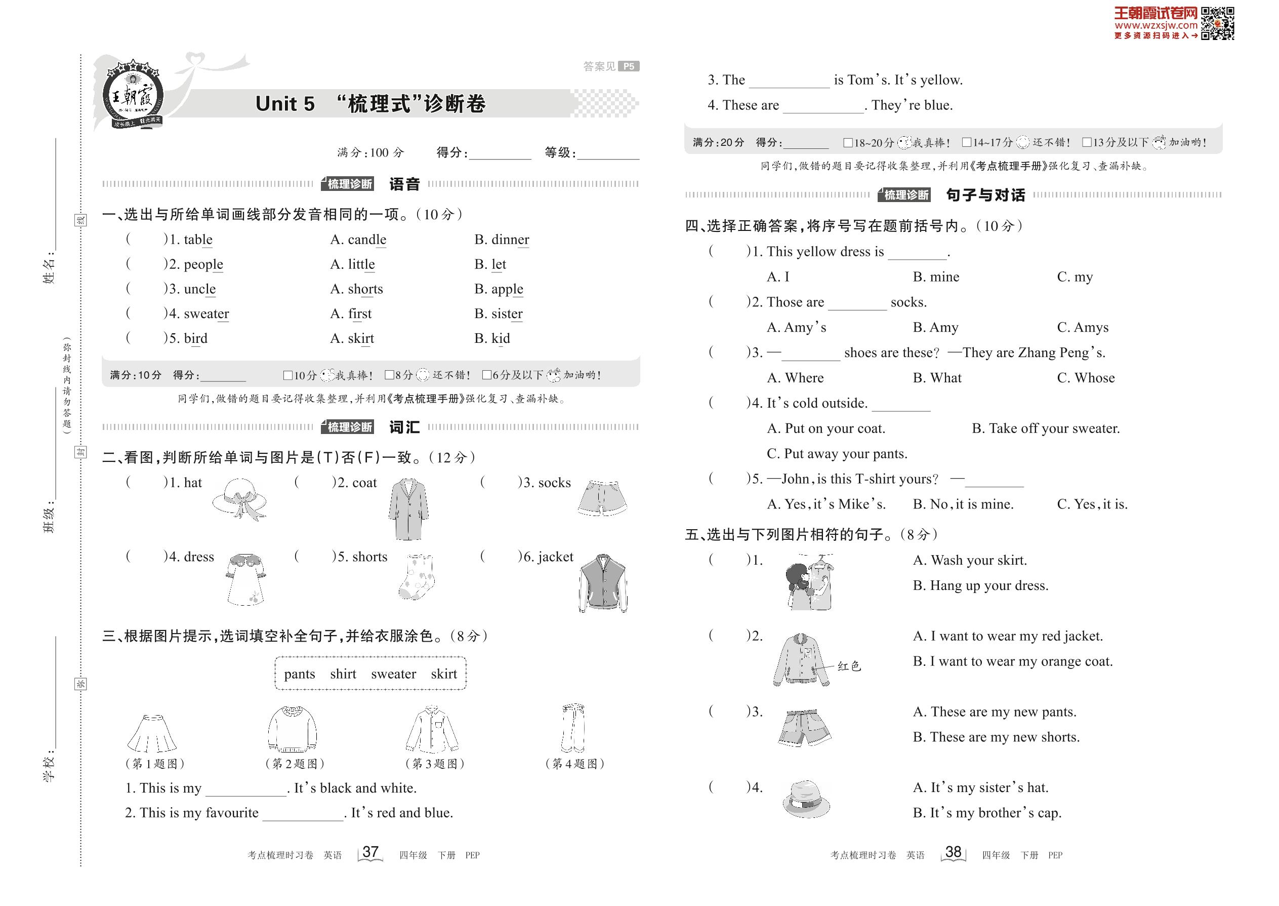 2023下册四年级英语人教PEP版 Unit 5 “梳理式”诊断卷