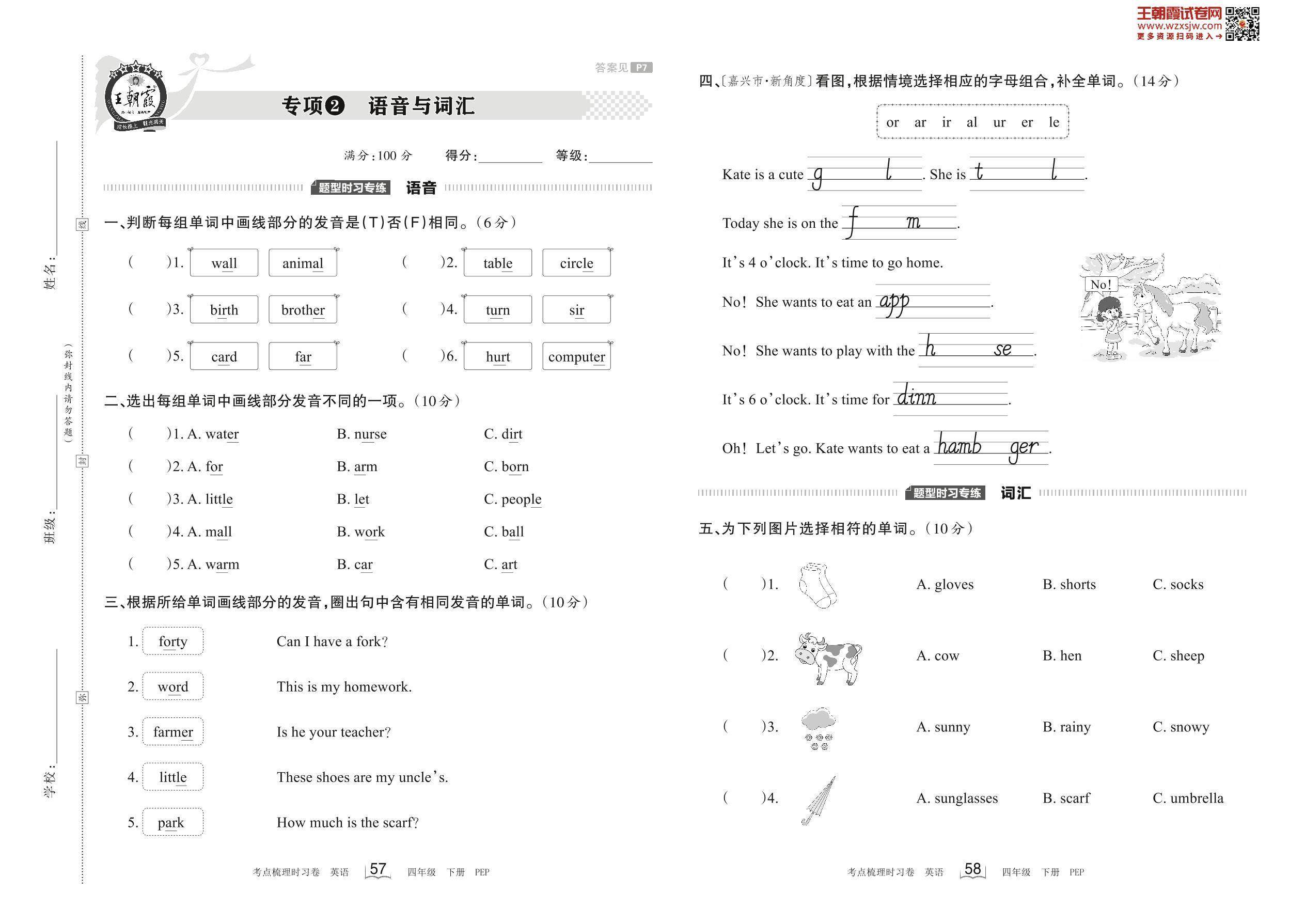 2023下册四年级英语人教PEP版 专项2 语音与词汇