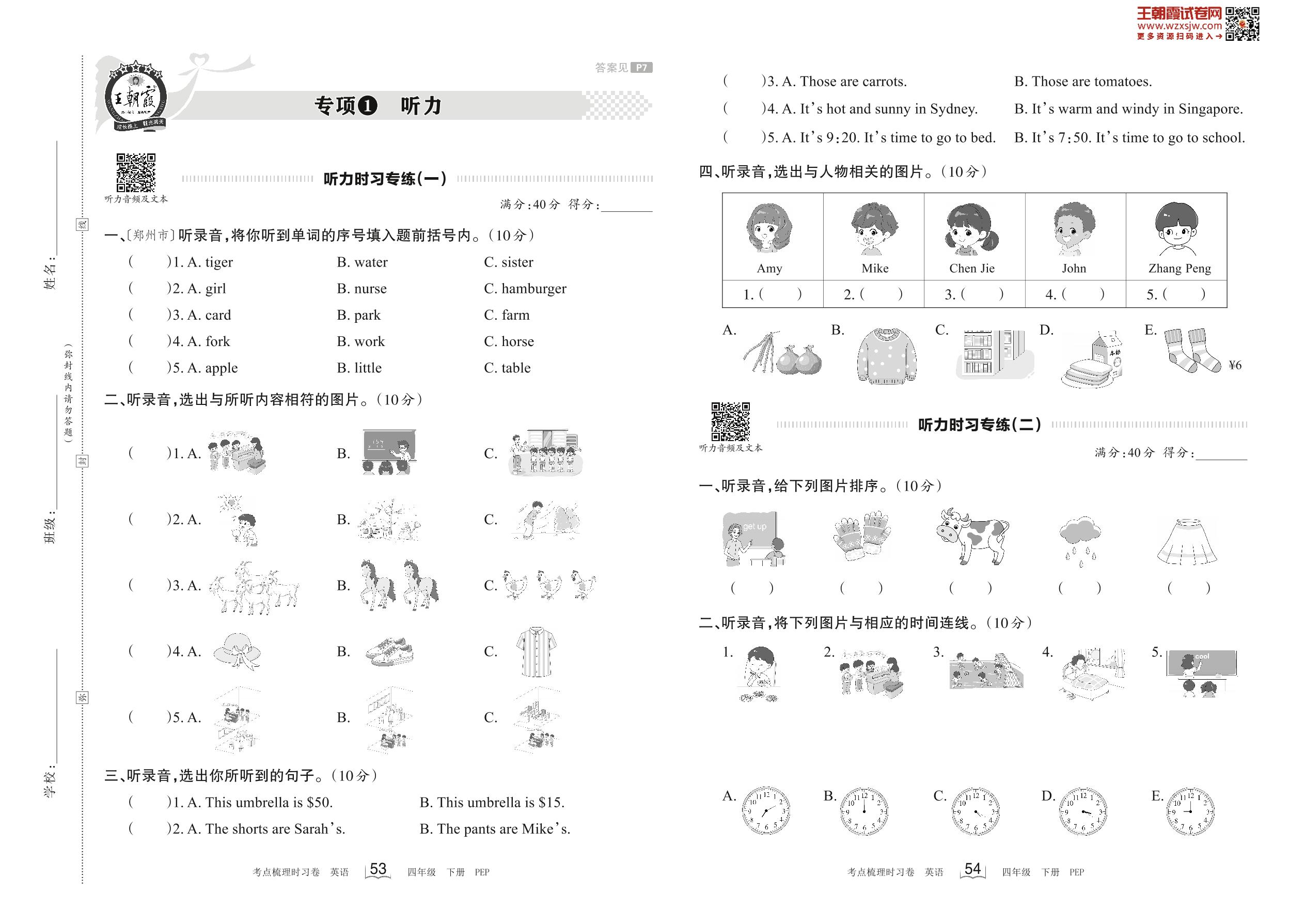 2023下册四年级英语人教PEP版 专项1 听力