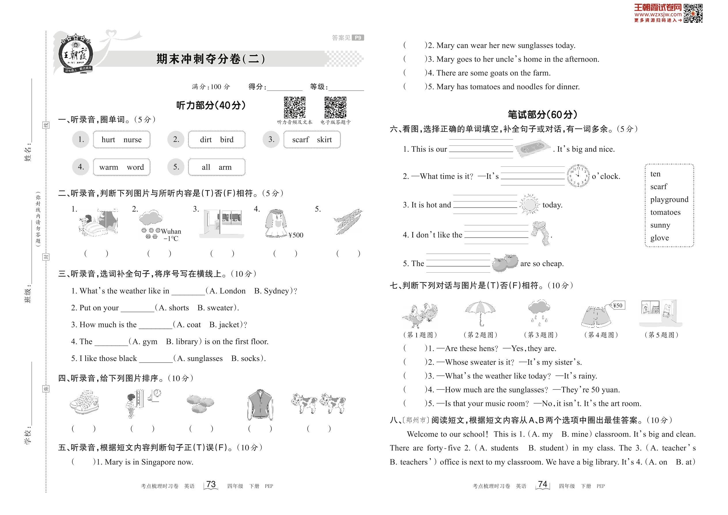 2023下册四年级英语人教PEP版 期末冲刺夺分卷(二)
