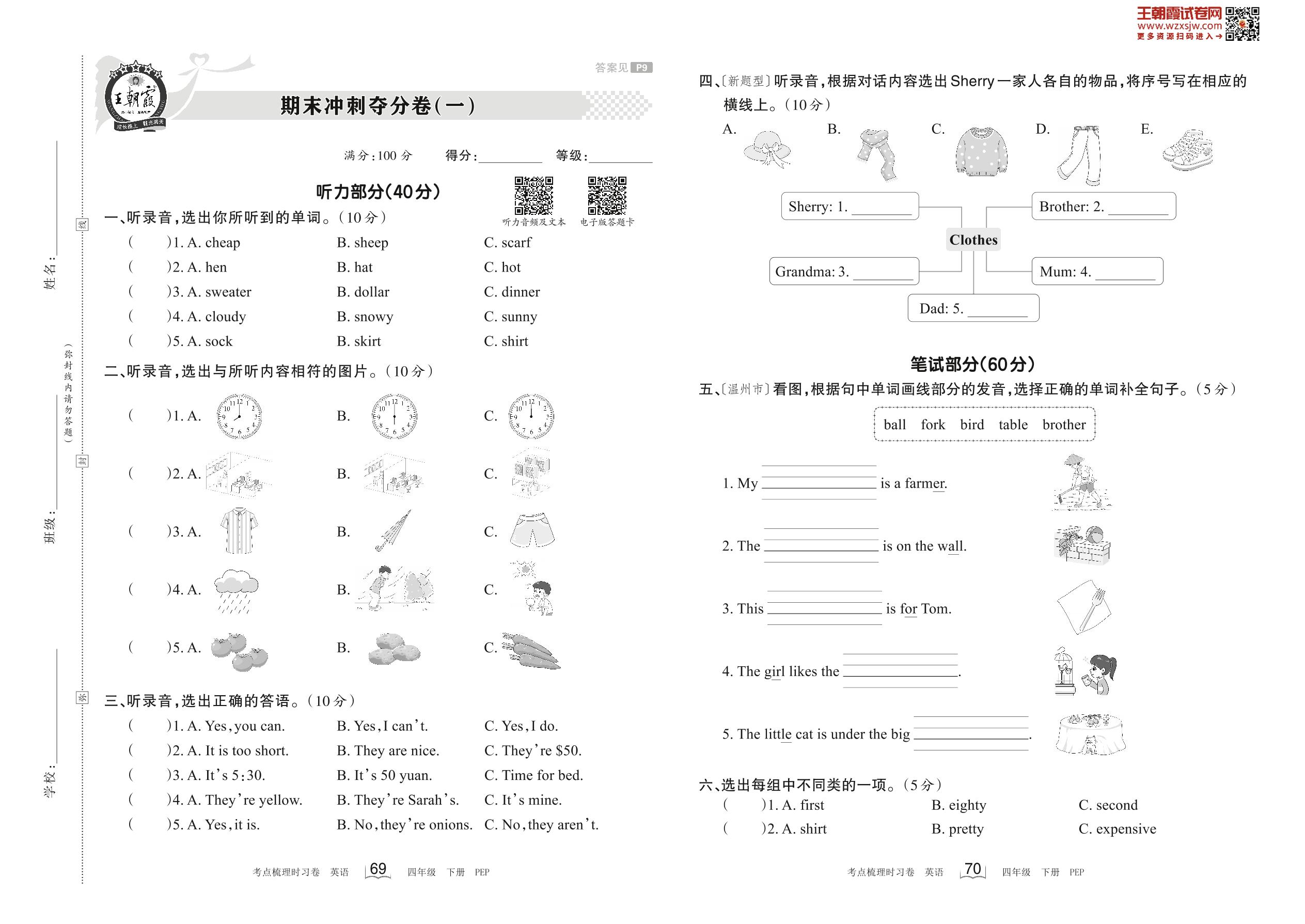 四年级英语人教PEP版(三起始)下册期末卷