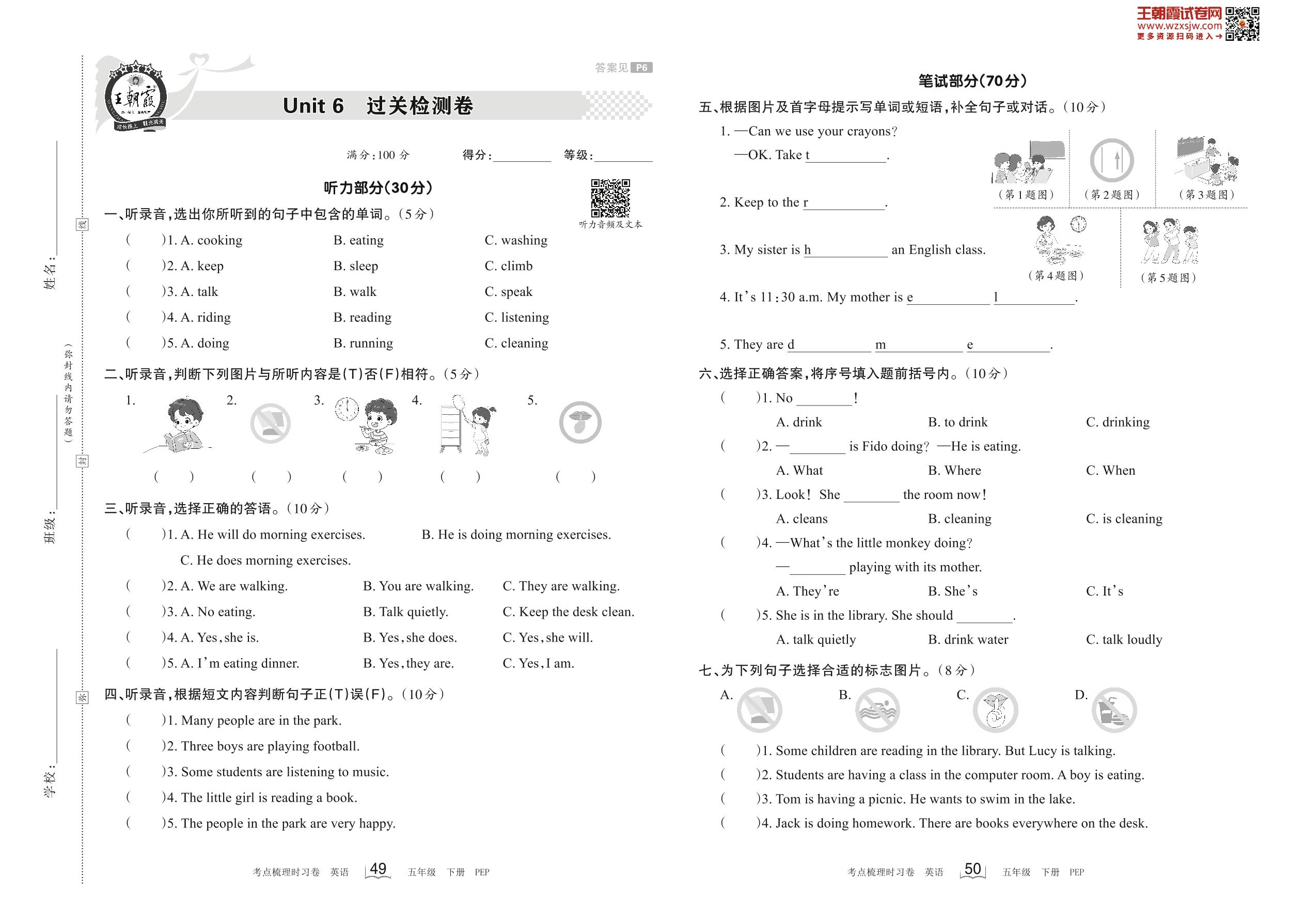 五年级英语人教PEP版(三起始)下册单元卷
