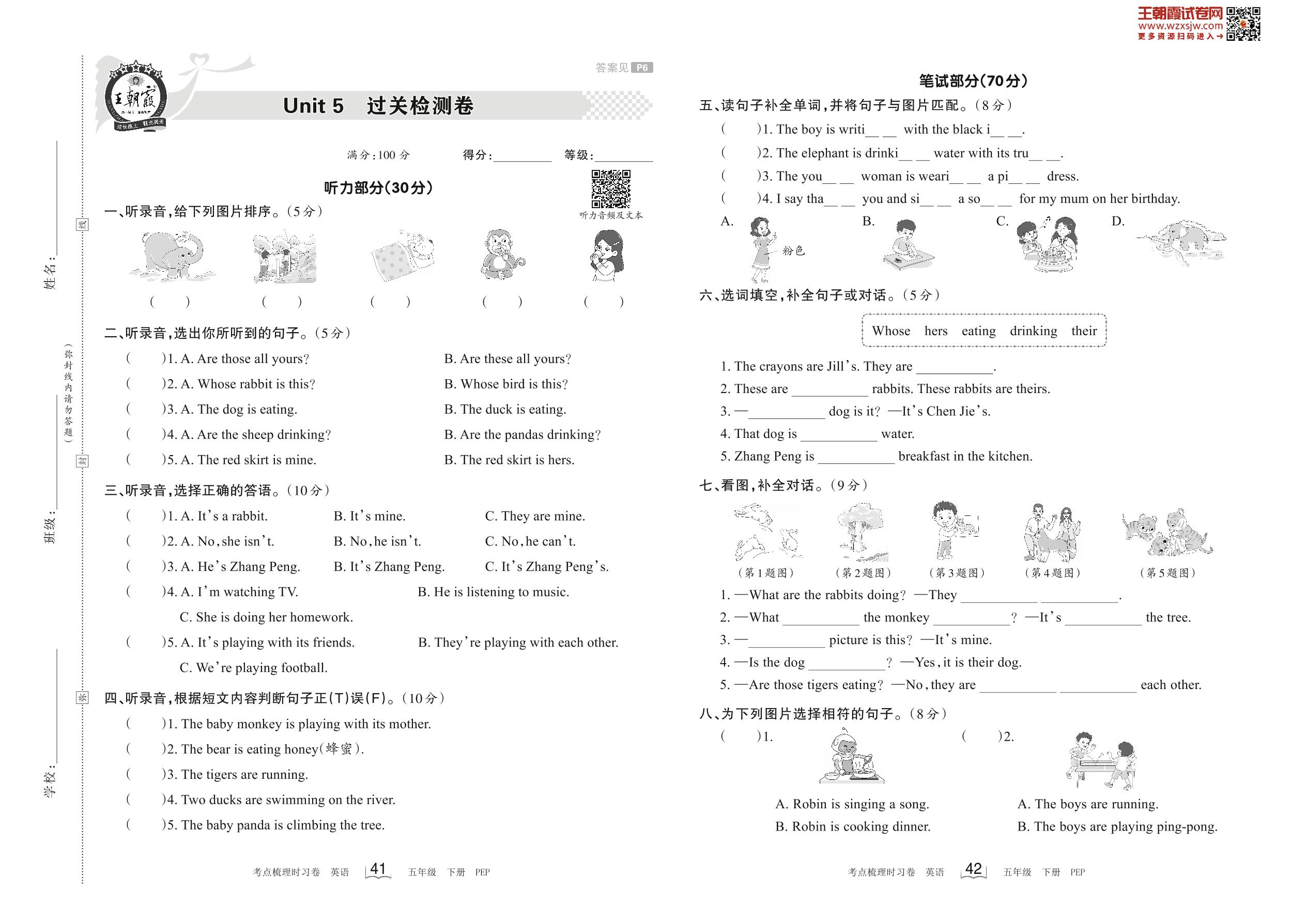 五年级英语人教PEP版(三起始)下册单元卷