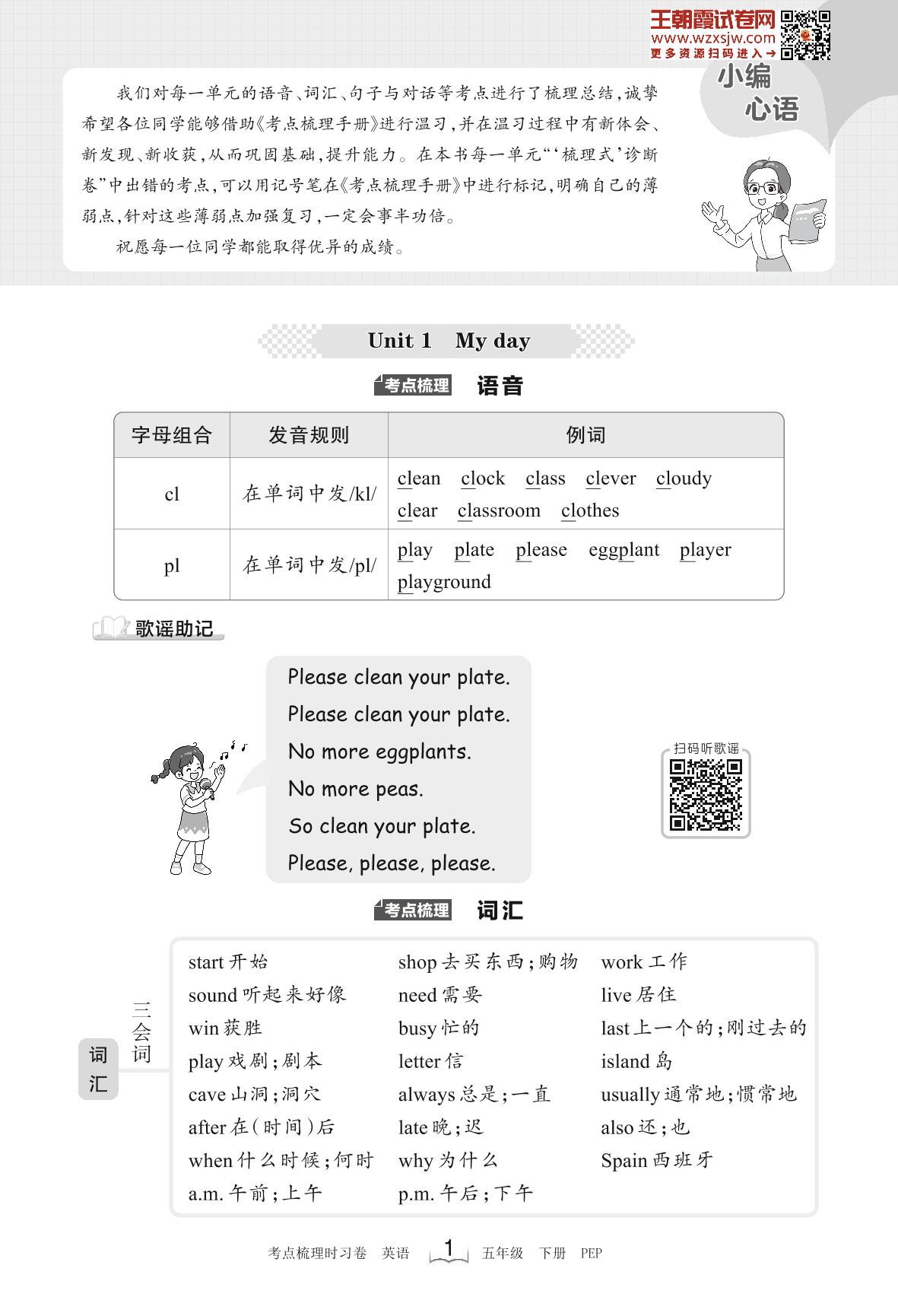 2023下册五年级英语人教PEP版 考点梳理手册——Unit 1 My day