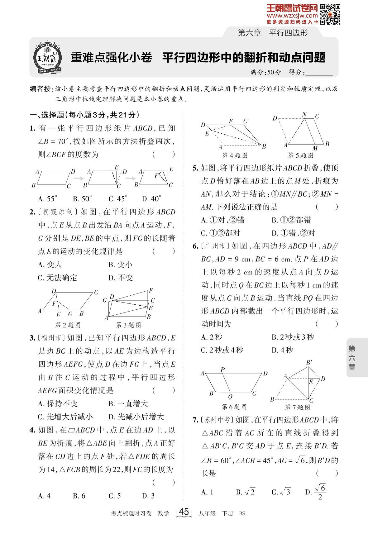 2023下册八年级数学北师版 第六章 重难点强化小卷 平行四边形中的翻折和动点问题