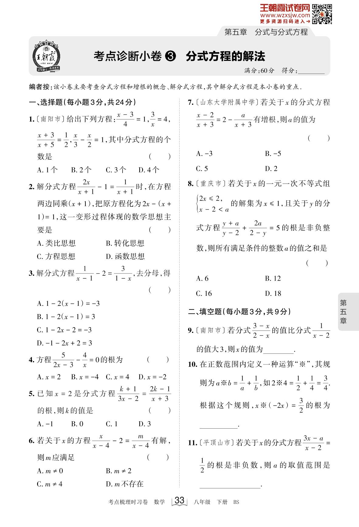 2023下册八年级数学北师版 第五章 考点诊断小卷3 分式方程的解法