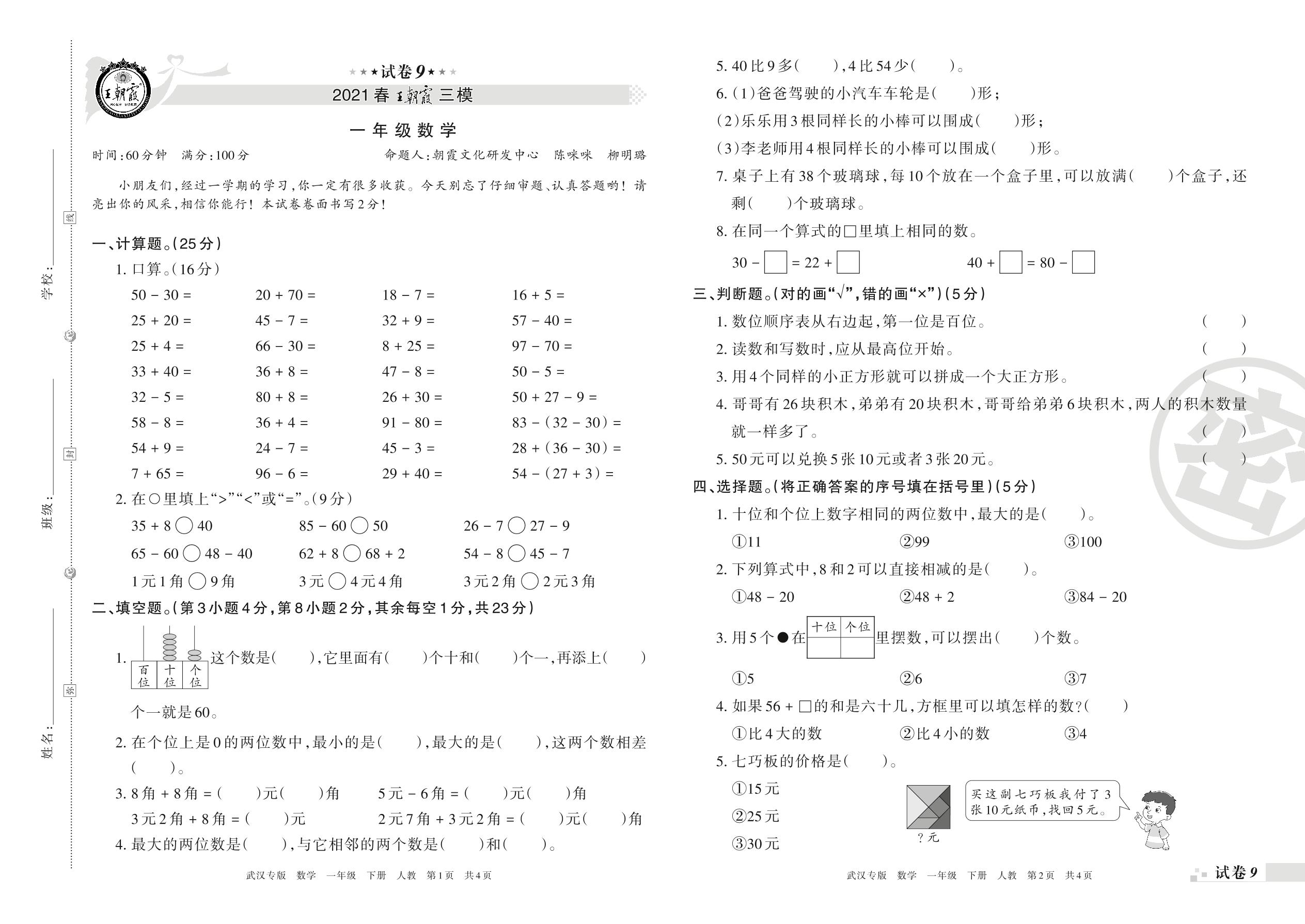 王朝霞期末模拟卷一年级下册数学(人教版)_R210802210749【9】