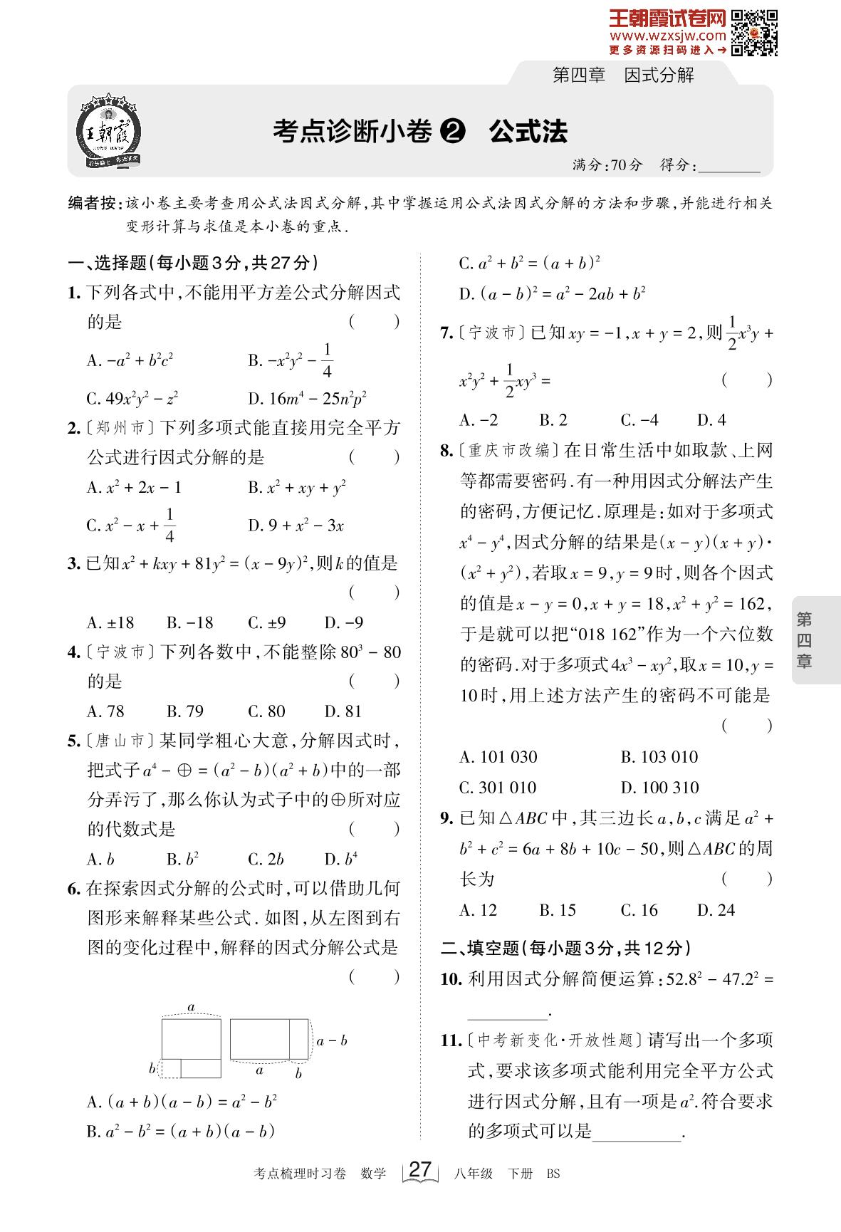 2023下册八年级数学北师版 第四章 考点诊断小卷2 公式法