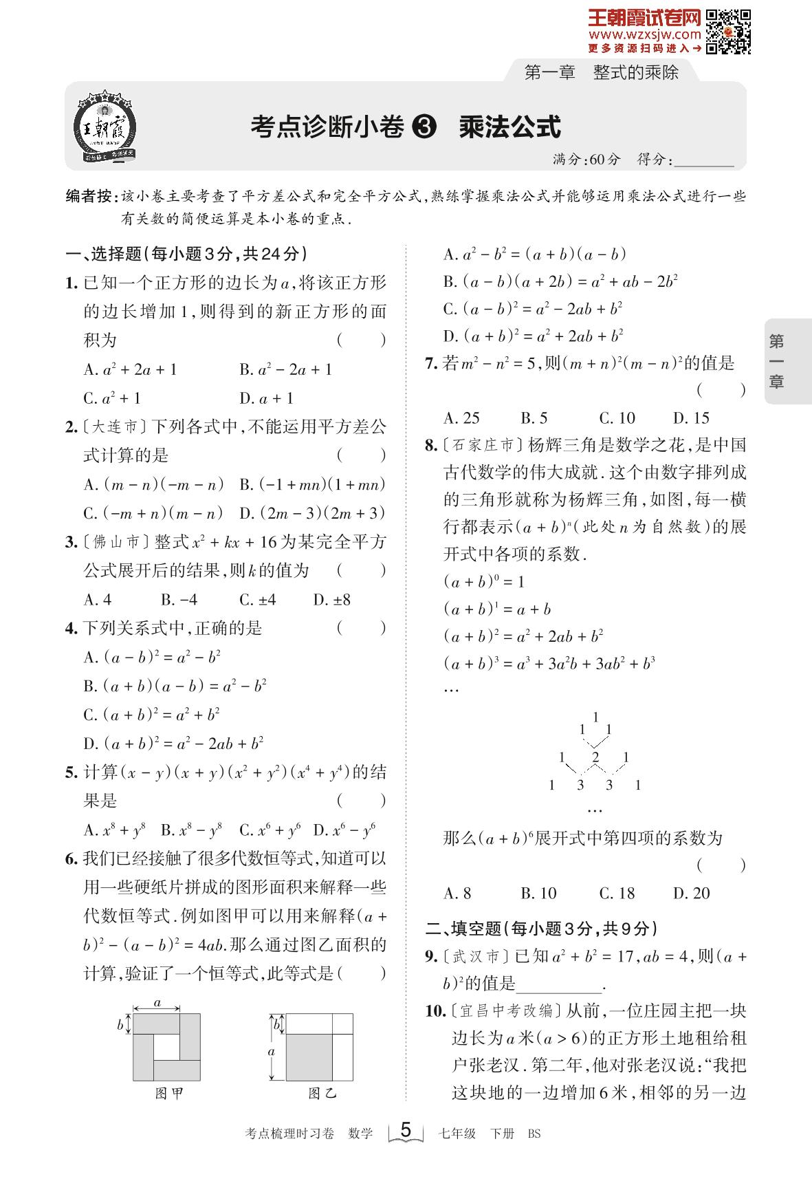 2023下册七年级数学北师版 第一章 考点诊断小卷3 乘法公式