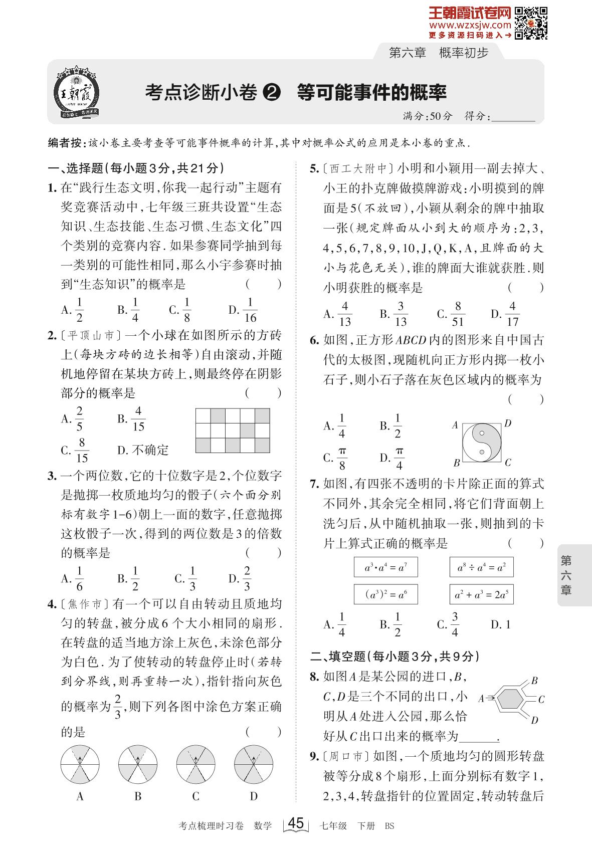 2023下册七年级数学北师版 第六章 考点诊断小卷2 等可能事件的概率