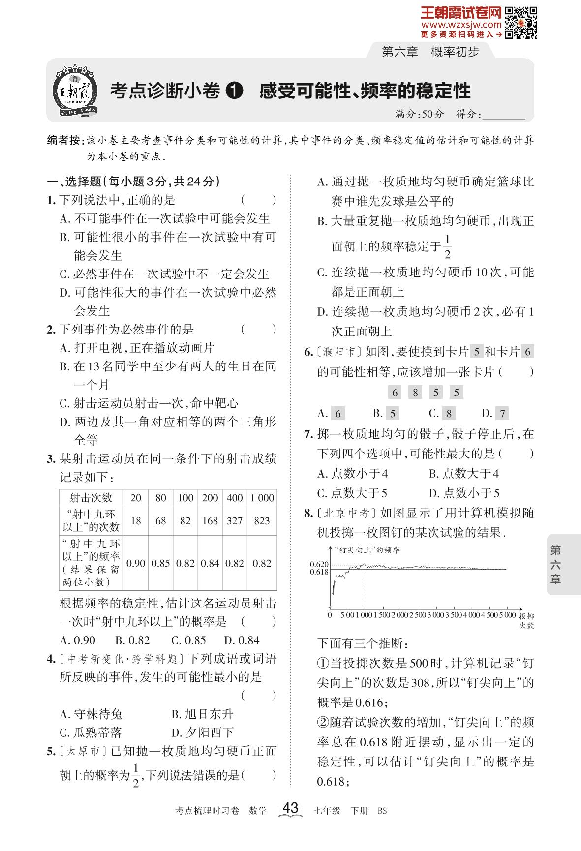 2023下册七年级数学北师版 第六章 考点诊断小卷1 感受可能性、频率的稳定性