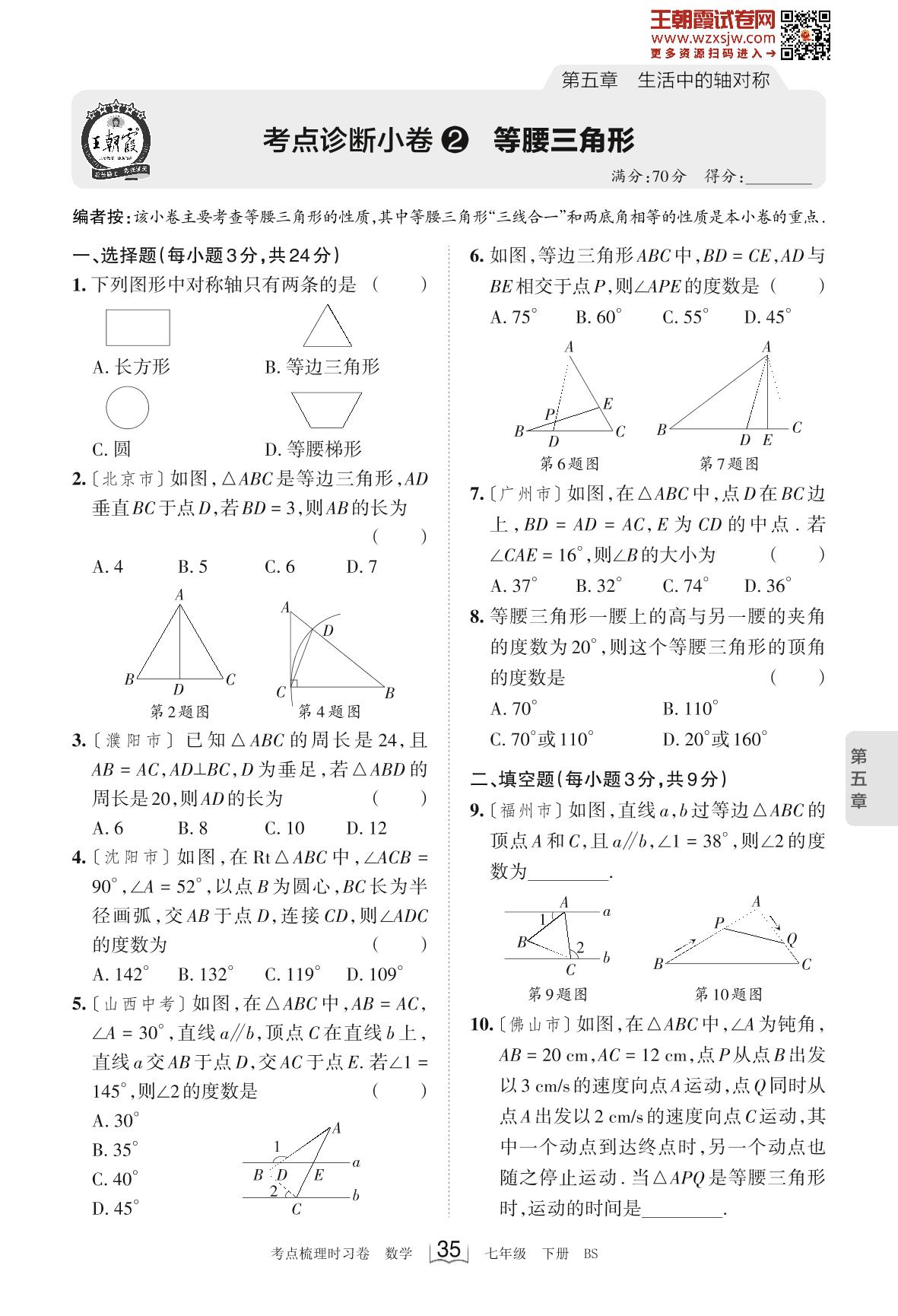 2023下册七年级数学北师版 第五章 考点诊断小卷2 等腰三角形